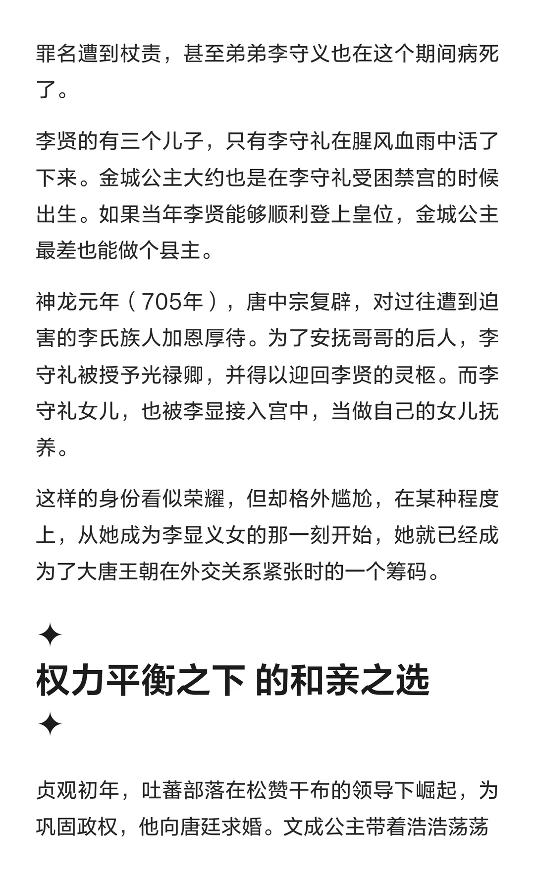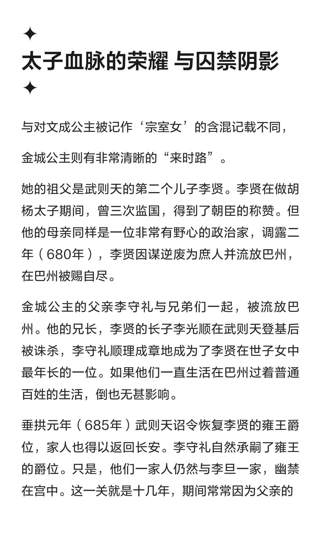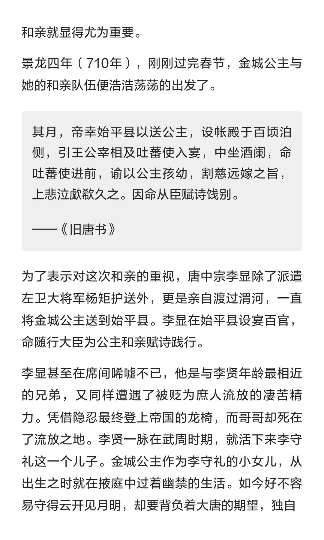 和文成公主“宗室女”的含混不同,她的出身写得很清楚:祖父是太子李贤,父亲李守礼一家曾被流放、又长期幽禁宫中。她大概率就在这种“太子血脉的荣耀+囚禁的阴影”里出生。后来被中宗收为义女,看似被抬进了皇室核心。实际上,从那一刻起,她就成了边境紧张时随时可用的筹码。