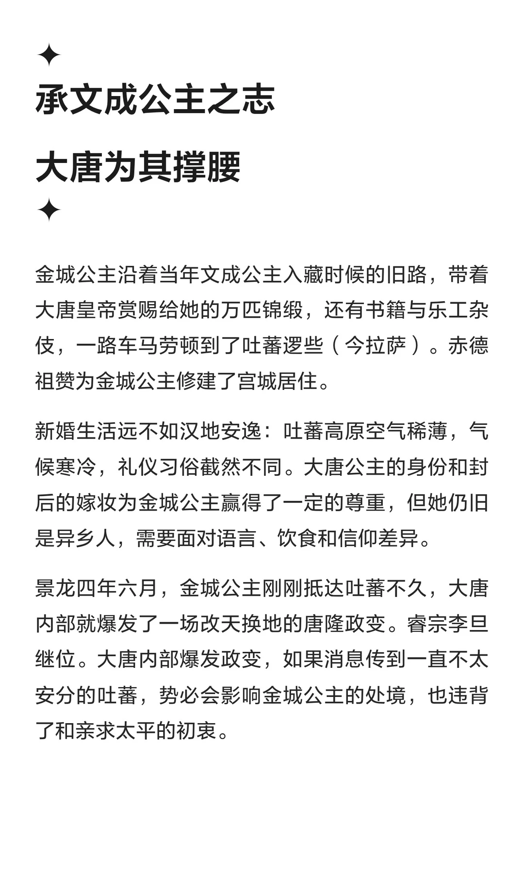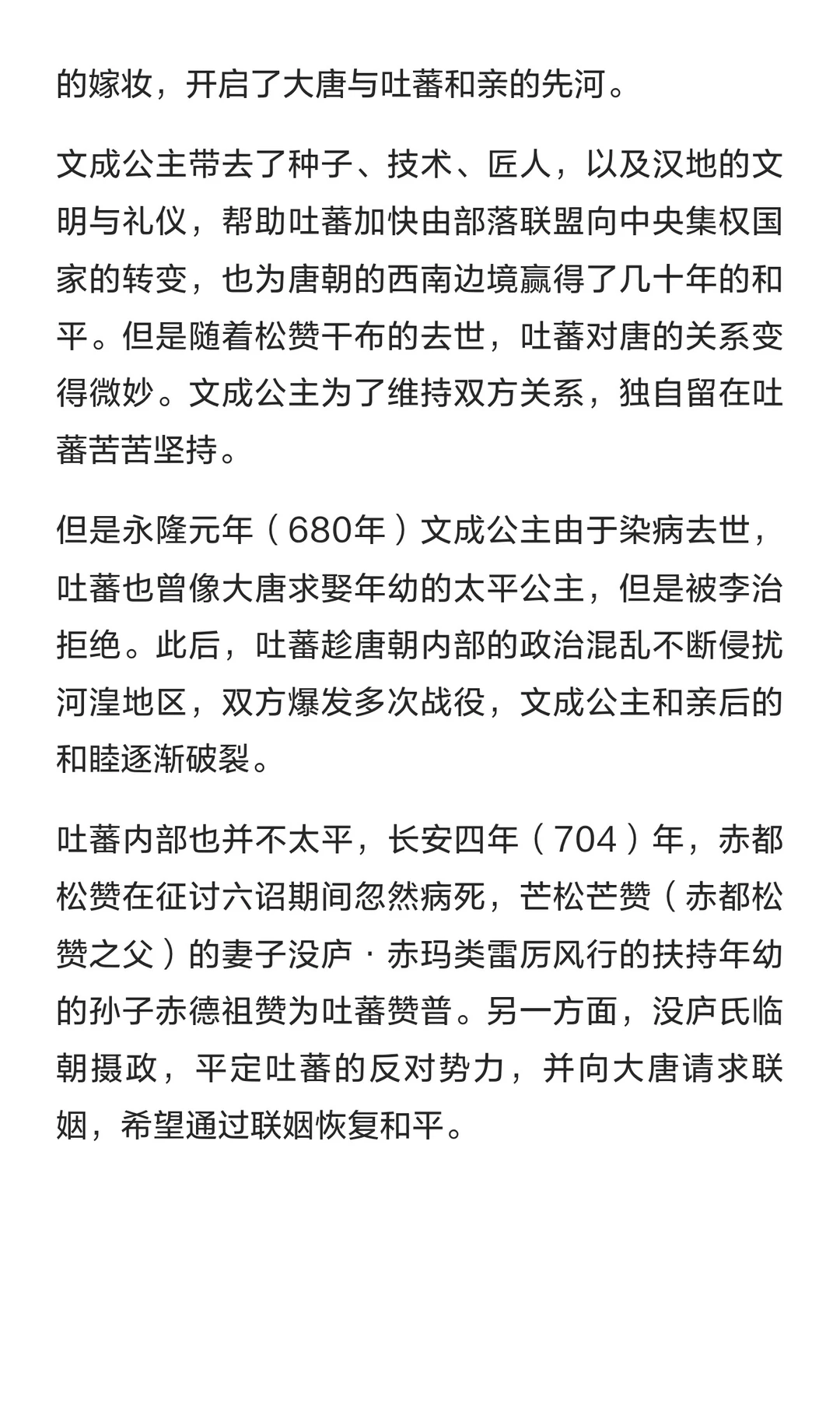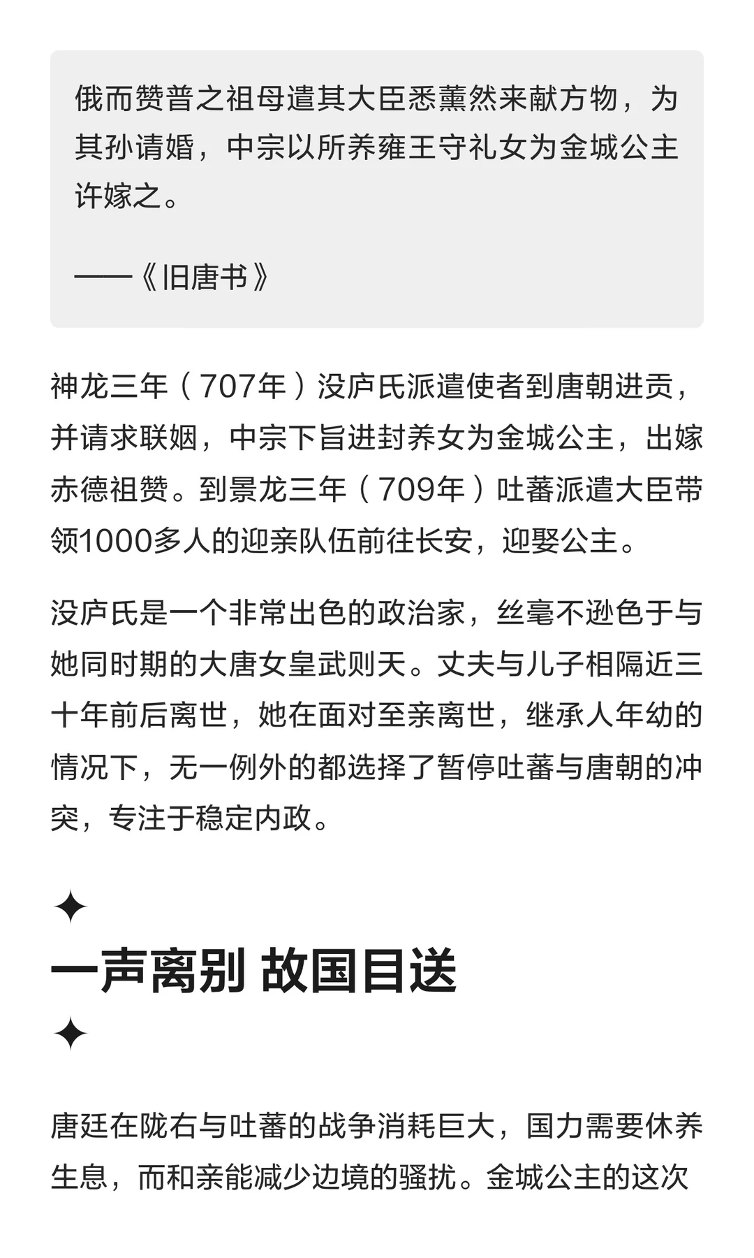 吐蕃那边也不平静:赞普年幼,祖母没庐氏摄政,为稳内政、止战火,派使求婚。唐廷需要休养生息,吐蕃需要联姻背书,于是金城公主被“许嫁”,这是大唐给她的“价值”。