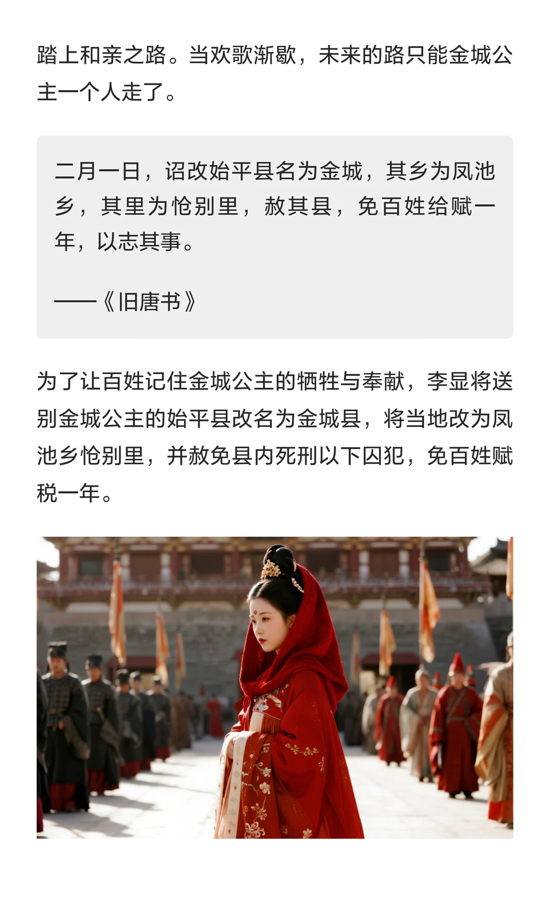送别那天,中宗亲自把她送到始平县,席间悲泣,还让群臣赋诗。甚至把始平县改名“金城”,乡里改作“怆别里”,免税一年。像是用行政命名给她立碑“你看,我们记得你牺牲”。 但更刺痛的是:这份“记得”,并不等于“让你选择”。