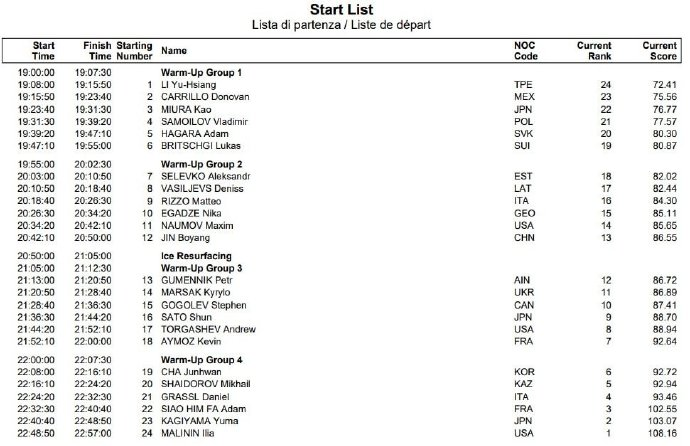 男单自由滑分组顺序 出炉:金博洋第二组出场