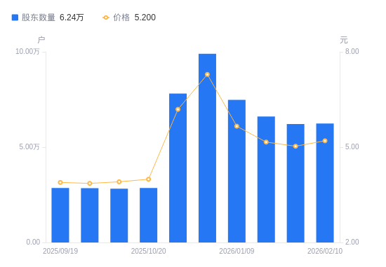 日期A股户数(户)流通A股户均持股数(股)户均持股市值(万元)2026-02-10624127458.213.882026-01-30621307492.063.772026-01-20660537047.093.642026-01-09748256220.943.522025-12-10990134701.223.432025-11-28781375957.253.692025-10-202860116275.016.492025-10-102822516491.826.452025-09-302851816322.386.302025-09-192862016264.216.33
