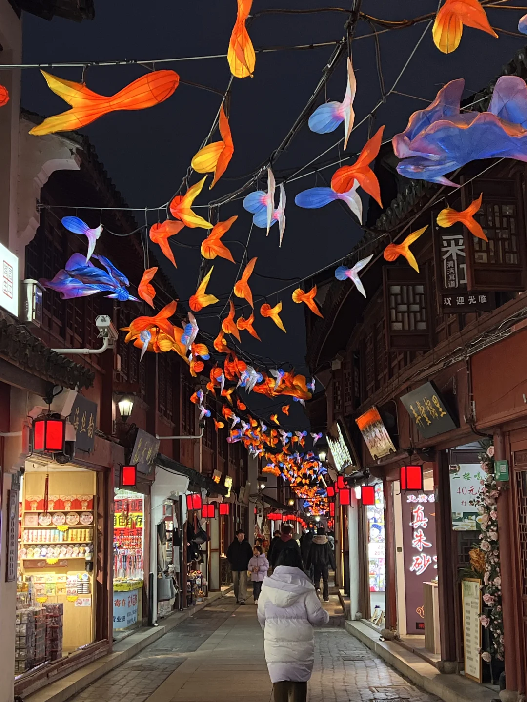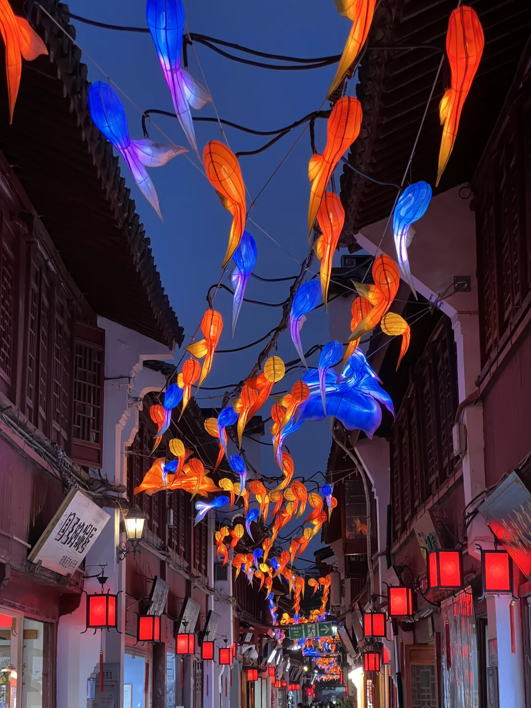 而且这条鱼灯小巷很长一条 弯曲的鱼灯很生动
