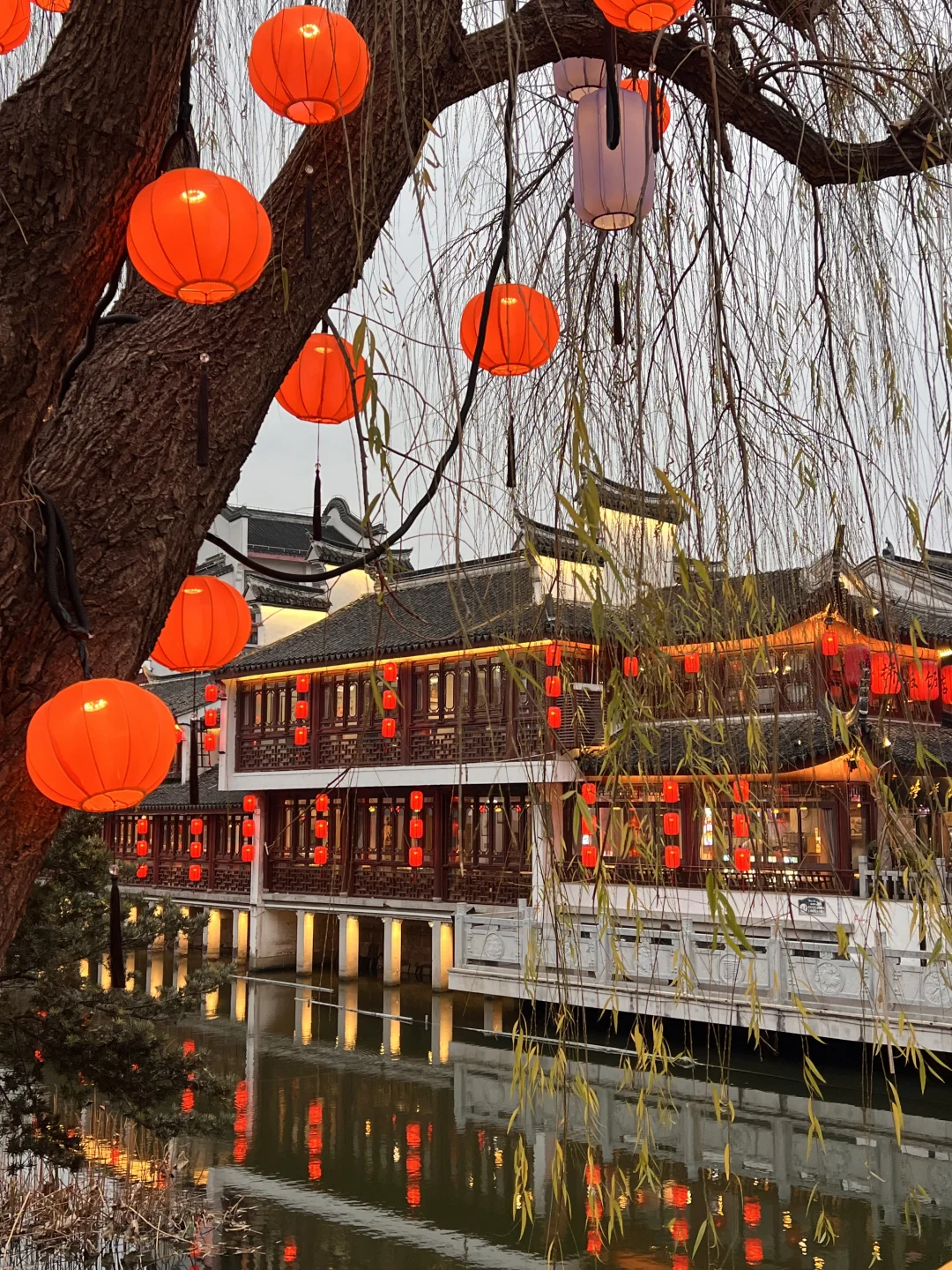 水边树枝枝头挂上了形状各异的红灯笼🏮