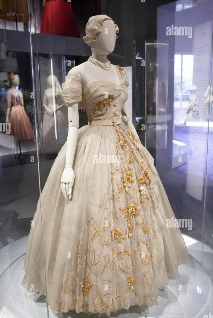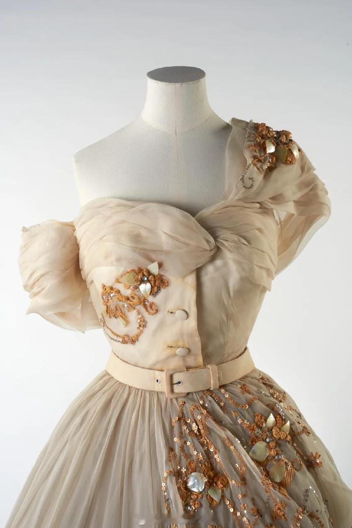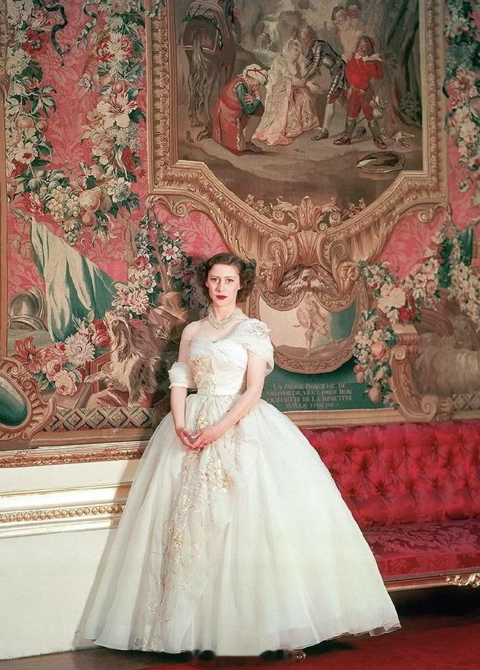英国玛格丽特公主在21岁生日摆拍时穿着的白色单肩礼服由Dior定制,采用真丝欧根纱制成,饰有金色刺绣和亮片,又是大摆蓬蓬裙搭配玛格丽特巅峰的颜值,基本能满足大家对公主的刻板印象 它被认为是高级定制时装的杰作,玛格丽特也称它是自己最爱的裙子 1968年,可能觉得自己不会再穿了,玛格丽特选择把这条礼服捐给了伦敦博物馆。后偶尔见于一些展览,包括V&A博物馆的迪奥专题展等,的确是一条值得永载史册的艺术品级别礼服