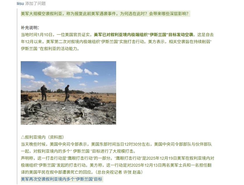 美军大规模空袭叙利亚,称为报复此前美军遇袭事件,为何选在此时?会带来哪些深层影响? 当地时间1月10日,一位美国官员证实,美军已对叙利亚境内极端组织“伊斯兰国”目标发动空袭。这是自去年12月以来,美军第二次对叙境内极端组织“伊斯兰国”实施打击行动。美方表示,相关空袭旨在持续削弱“ 伊斯兰国 ”在叙利亚的活动能力。 △叙利亚境内(资料图) 当天晚些时候,美国中央司令部表示,美国东部时间当日12时30分左右,美国中央司令部部队与伙伴部队一起,对叙利亚境内的多个“ 伊斯兰国 ”目标进行了大规模打击。 声明称,这一打击行动是“鹰眼打击行动”的一部分。“鹰眼打击行动”是2025年12月19日美军在叙利亚境内对极端组织“伊斯兰国”发起的打击行动。美方称,这一行动是对2025年12月13日两名美军士兵和一名担任翻译的美国平民在叙中部遭袭死亡的回应。(总台央视记者 许弢 赵淼) ------------------------------------ 这提问没改过啊,写的也很清楚啊,这回答里一帮人发啥癫?怎么拐到简中特供,赢学上去的?