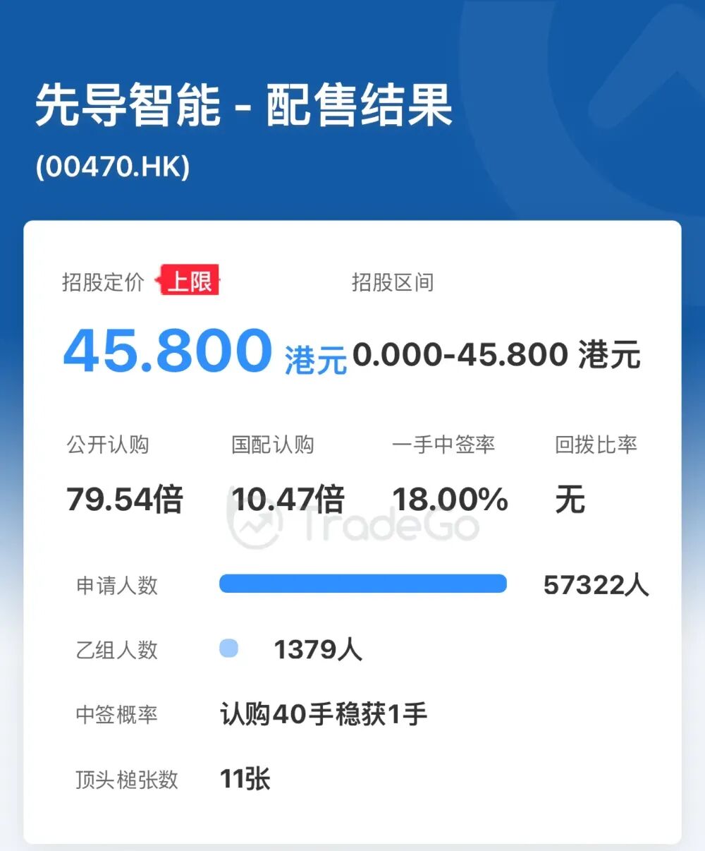 配售结果显示,先导智能本次申购人数共57,322人,公开认购79.54倍,国配认购10.47倍,一手中签率18%。