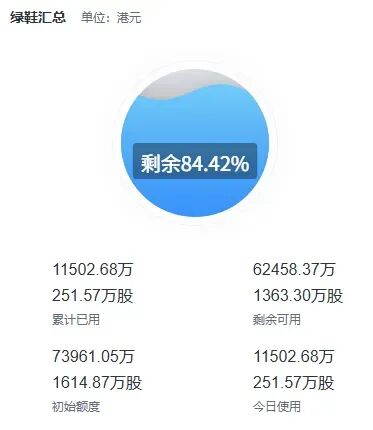 据LiveReport大数据估算,截至首日收盘绿鞋已用1.15亿港元,目前仍剩余6.25亿港元(约84.42%)。