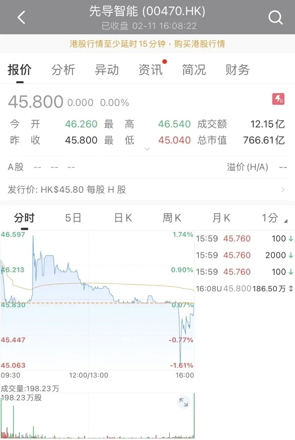 上市首日,先导智能以46.26港元开盘,较45.80港元的发行价小幅上涨约1%,盘中一度冲高至46.54港元,但随后股价回落,临近收盘前跌破发行价,而后绿鞋摩根大通发力,最终收盘报于45.8港元,与发行价持平。