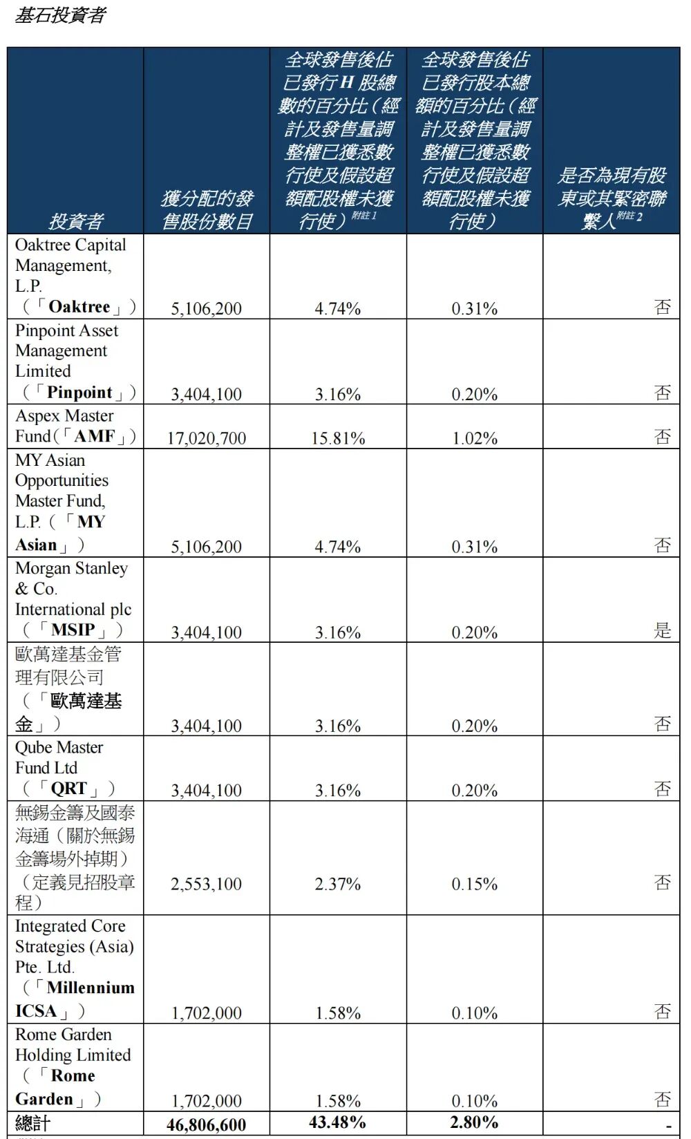 公司本次全球发售10,765.84万股(另有15%绿鞋),发行价45.8港元,募资总额约49.31亿港元。以机制B分配,公开发售占10%,无强制回拨;国配引入了10家基石投资者,认购约21.44亿港元,占全球发售股份的43.48%。