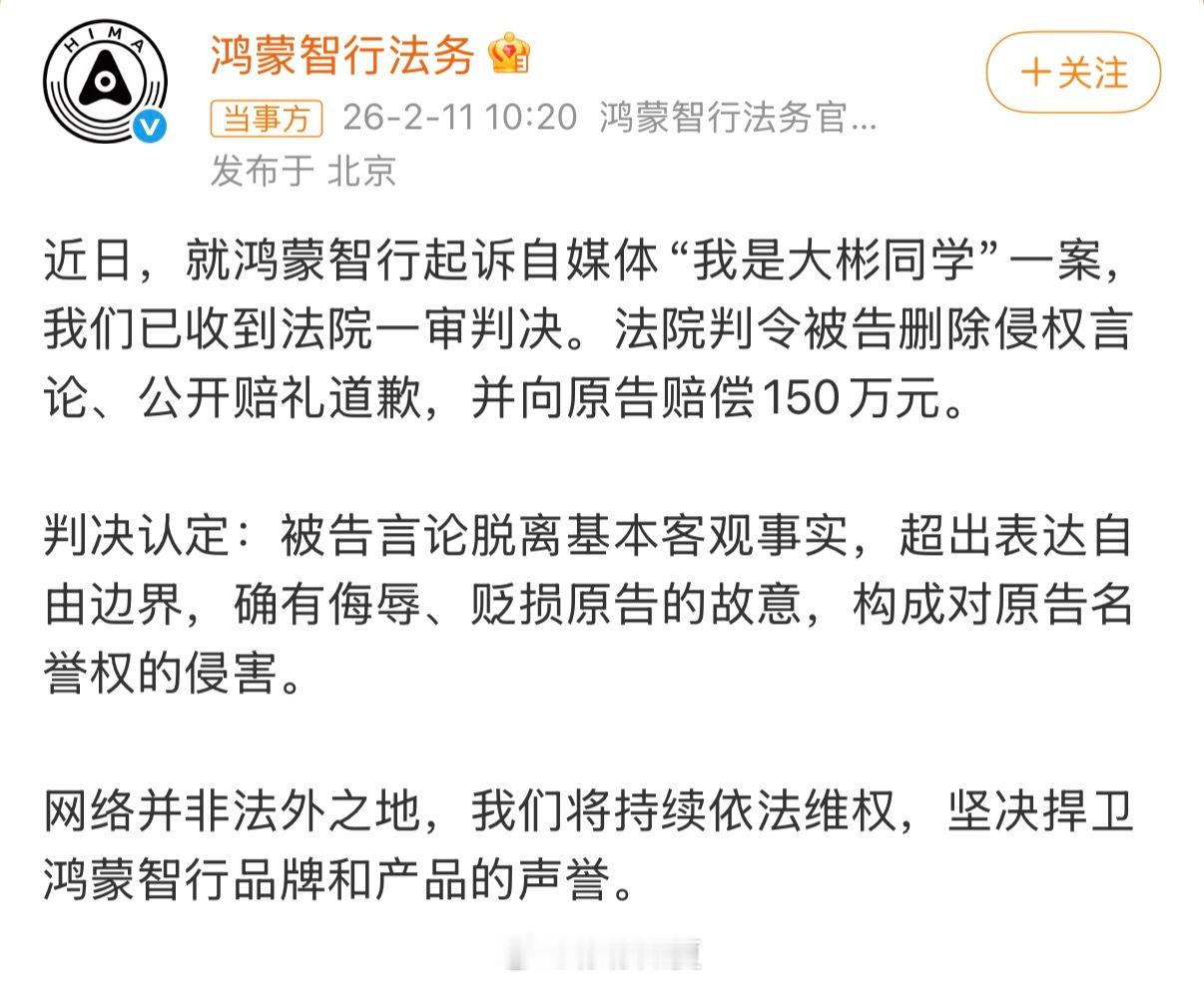 普通人看完只想说“车圈真的好恐怖”看了这个大彬发微博也没说啥吧 而且说的也是事实吧?最后被华为鸿蒙以“脱离基本客观、贬损”等理由告赔大彬150万哪怕是自媒体的他也得脱一层皮了。慰来汽车也把他告了…….我是大彬同学被判赔鸿蒙智行150万
