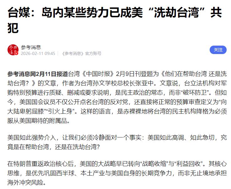 美国在洗劫台湾,岛内有人帮忙坑自己人! 台湾《中国时报》2月9日登了一篇张亚中写的文章,他文章里问:“他们是在帮台湾,还是在洗劫台湾?” 这事说到底,就是民进党当局要花一大笔钱,向美国买武器,这笔钱有1.25万亿元新台币,差不多是台湾一年总预算的三分之一,真是个天文数字。 按台湾的规矩,这么多钱,必须经过台湾立法机构审查,议员们有权问清楚,这笔钱具体花在哪,买的武器有用没用,能不能保护老百姓,也能要求删减不合理的部分。 这本来就是很正常的事,张亚中也说,这是民主该有的样子,根本不算破坏防务。 毕竟这钱不是民进党自己的,是台湾老百姓辛辛苦苦交的税,大家的血汗钱,拿去买武器,自然有权问明白,这是天经地义的。 可让人想不通的是,台湾自己审查自己的钱,跟美国一点关系没有,美国却跳出来管闲事。 美国的议员,既不是台湾的官,也不花台湾老百姓的钱,没资格管台湾的事,却公开批评台湾的反对党,还说反对党审查预算,是向大陆低头、自找麻烦。 这话太没道理了,台湾是中国的一部分,自己的事,轮不到美国指手画脚。美国这么说,就是想把台湾的立法机构当成自己的附属品。 意思就是,美国让过这笔预算,台湾就必须过,不能质疑、不能审查,根本不把台湾老百姓的意愿放在眼里,张亚中也点透了,这根本就不是民主。 有人会问,美国为啥这么急着让台湾通过这笔预算?真的是帮台湾吗?肯定不是,其实美国就是想把台湾当成提款机,尽量榨干台湾的价值。 这些年,美国不想再为台湾承担风险,只想在两岸没冲突前,把台湾的钱、核心产业,都弄到自己手里。 军购只是美国抢台湾钱的一个办法,除此之外,美国还逼着台湾的台积电搬到美国,台积电是台湾最赚钱的企业,掌握着先进的芯片技术,很多台湾人靠它吃饭、就业,美国把它挖走,就是要掏空台湾的经济。 而且美国卖给台湾的武器,要么很贵,要么是过时的,后续维修费还高得吓人,台湾只能任由美国要价。 最可气的是,美国能这么顺利地抢台湾的钱,全靠岛内一些人帮忙,这些人就是张亚中说的共犯,主要就是民进党当局。 他们心甘情愿听美国的话,主动编列天价军购预算,还刻意隐瞒预算细节,规避监管,就是配合美国坑自己的同胞。 大家心里都清楚,美国从来不会真心帮台湾,只是把台湾当成遏制大陆、抢钱的工具,等台湾没用了,就会毫不犹豫抛弃它。 岛内这些帮美国的人,为了自己的利益,出卖同胞、挥霍老百姓的血汗钱,迟早会被台湾人唾弃。