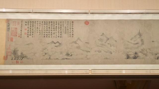 南宋米友仁《潇湘图卷》位于历代绘画馆起首。这件作品为上博书画收藏中的菁华作品之一,米友仁(1074—1153)系米芾长子,父子并创“米家云山”。此图系其绍兴五年(1135)为左达功作。曾经南宋朱熹等十六名家题跋,十分罕见。