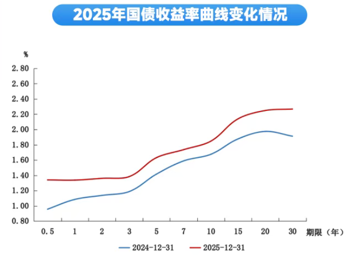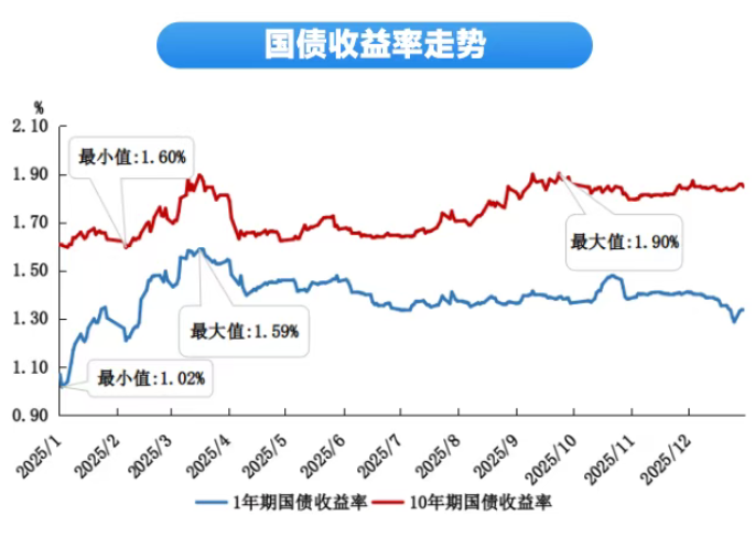 债券市场方面,数据显示,2025年末,10年期国债收益率为1.85%。10年期与1年期国债收益率利差为51个基点,较2024年末收窄8个基点。