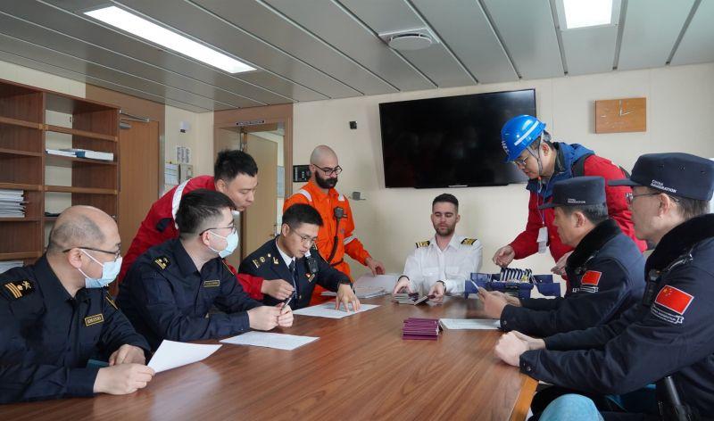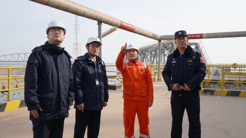 海事部门依托海上交通安全网格化治理模式,通过CCTV远程监控系统实时跟踪作业动态,结合现场巡查对船舶作业情况及系泊安全进行监督;边检民警现场与船舶代理和码头作业人员进行对接,提前对船舶船员入境申报信息进行预检审核;海关工作人员精准掌握卸载进度及输送管线情况,紧密衔接现场查验、样品取样、送检检测等监管环节,确保重要能源通关接卸外输的全链条安全闭环管理。此次联合检查正值该轮进行船员换班,为提升服务效率,三方还联合开展换班船员相关事项联合查验,确保换班过程安全高效、手续便捷顺畅。