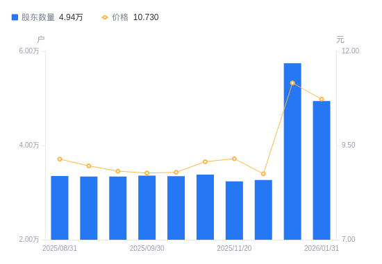 日期A股户数(户)流通A股户均持股数(股)户均持股市值(万元)2026-01-31494338519.459.142026-01-20574507330.588.182025-12-103268812883.6911.272025-11-203238813003.0311.902025-10-313383712446.2011.292025-10-203350812568.4011.052025-09-303360812531.0110.992025-09-203343312596.6011.112025-09-103340112608.6711.302025-08-313354012556.4111.48