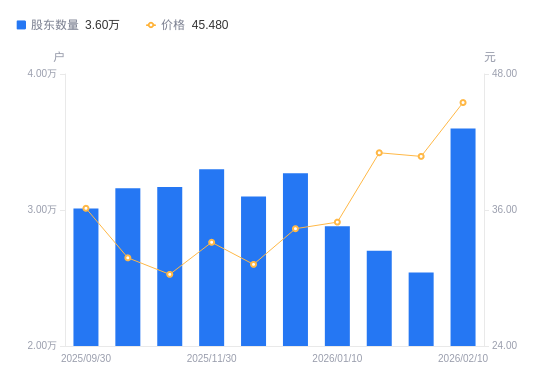 日期A股户数(户)流通A股户均持股数(股)户均持股市值(万元)2026-02-10360007672.0234.892026-01-302540010873.7344.292026-01-202700010229.3641.992026-01-10288009590.0233.502025-12-31327008446.2629.012025-12-20310008909.4127.802025-11-30330008369.4527.742025-11-10317008712.6826.422025-10-31316008738.9227.772025-09-30301079172.0333.16