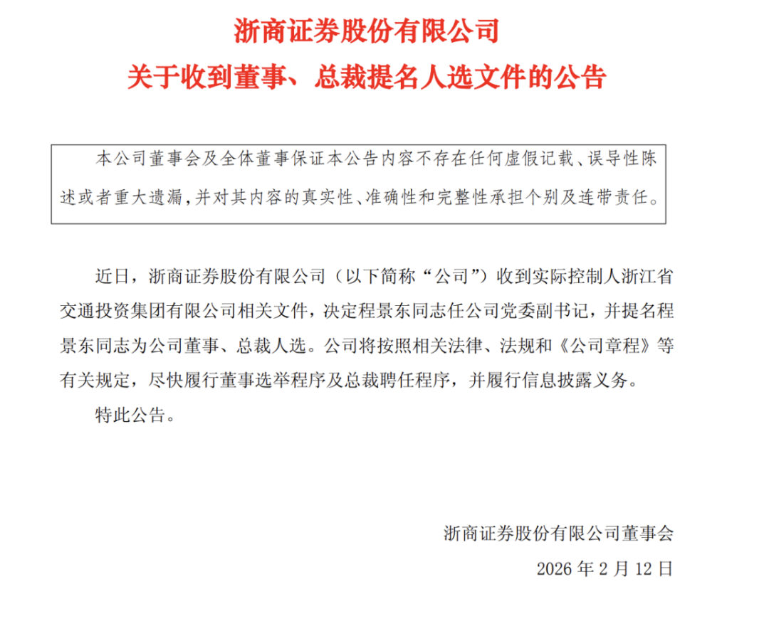 2月11日,浙商证券管理层迎来重要调整。浙江交通集团宣布人事任免决定:现任浙商证券党委委员、副总裁程景东被任命为公司党委副书记,并提名为董事、总裁人选。