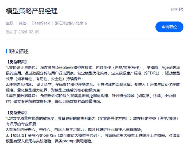 值得关注的是,近期DeepSeek开放了多个技术岗位招聘,包括产品经理/模型策略产品经理、客户端/前端/全栈研发工程师等。