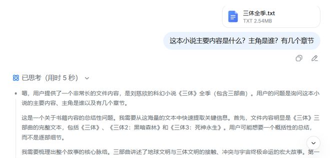 三体三部曲合计总计90万字,这也意味着DeepSeek能够单次完成处理《三体》全集的长文本。