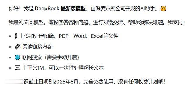 《科创板日报》记者实测中发现,DeepSeek在问答中称自身支持上下文1M,可以一次性处理超长文本。此外,版本模型知识库截止时间更新至2025年5月。不过,新版本目前不支持视觉输入,也不具备多模态识别能力。