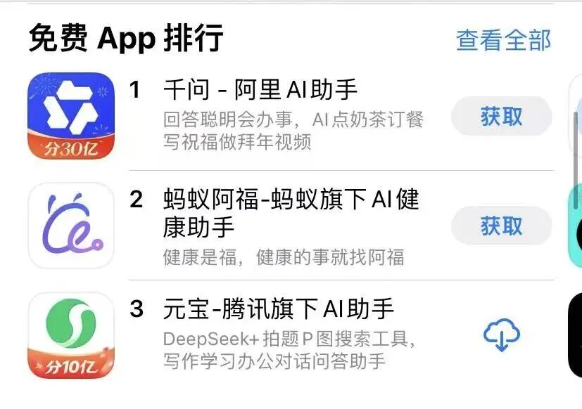2月11日,苹果AppStore中国区免费应用排行榜显示,千问、蚂蚁阿福下载量猛增,包揽总榜前二。