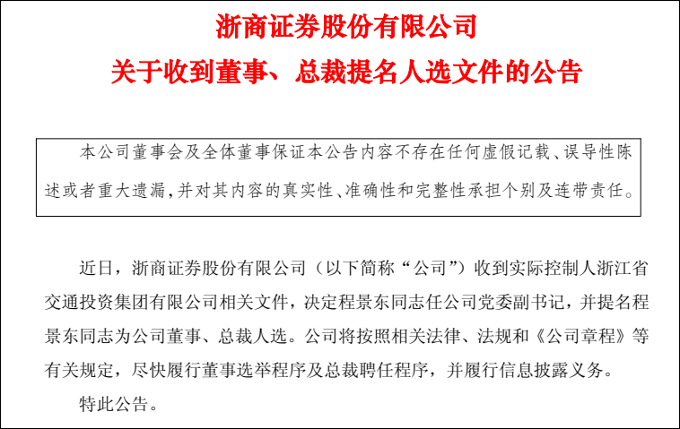 2月11日,浙商证券迎来重要管理层调整。浙江交通集团正式宣布人事任免决定:现任浙商证券党委委员、副总裁程景东被任命为公司党委副书记,并提名为董事、总裁人选。这一关键岗位的布局,既是对程景东过往履职能力与工作成效的充分肯定,也为其全面执掌公司经营管理、全力推动浙商证券“十五五”战略落地注入了新的领导力与强劲动能。