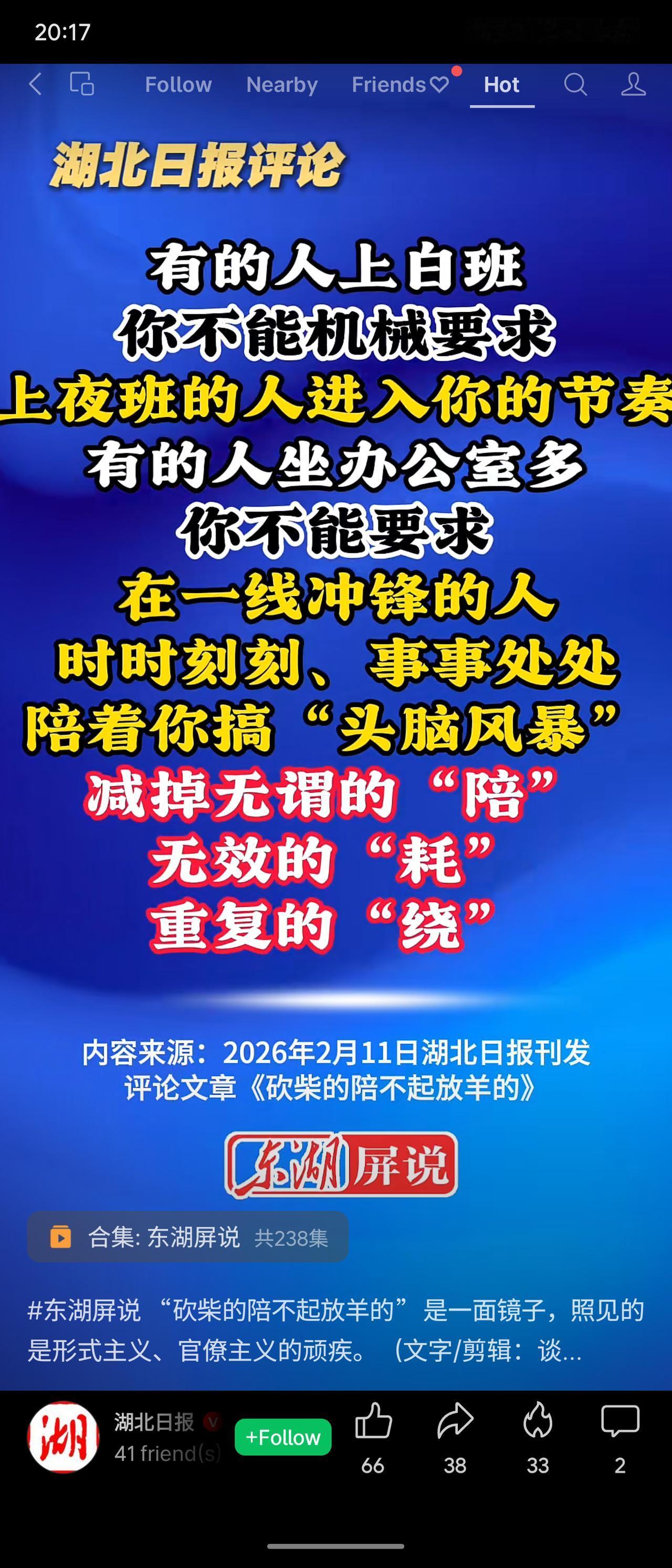 湖北日报评论《砍柴的陪不起放羊的》直陈基层痛点:重会场不重现场,实干者被迫陪会误了“砍柴”,只得加班弥补。文章剑指形式主义顽疾,呼吁减掉无谓的“陪”、无效的“耗”,让一线从文山会海中松绑。