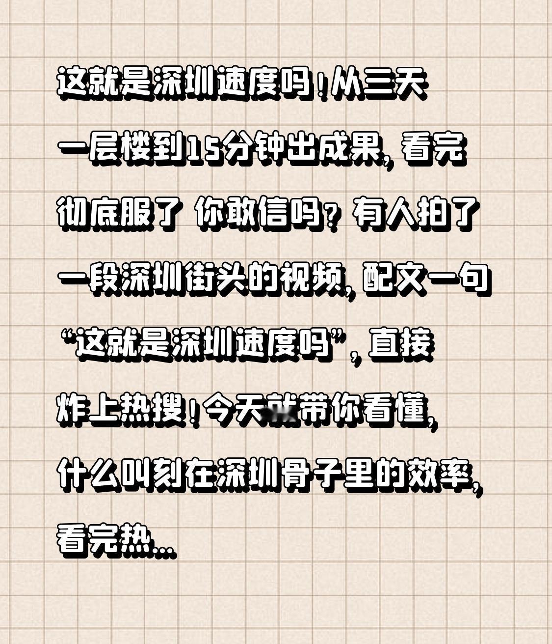 这就是深圳速度吗!从三天一层楼到15分钟出成果,看完彻底服了 你敢信吗?有人拍了一段深圳街头的视频,配文一句“这就是深圳速度吗”,直接炸上热搜!今天就带你看懂,什么叫刻在深圳骨子里的效率,看完热血沸腾! 很多人对深圳速度的印象,还停留在几十年前“三天一层楼”的国贸大厦。当年这句口号响彻全国,让深圳一夜间成为中国改革开放的标杆。但你以为这就是极限了?大错特错!现在的深圳,速度早已刷新认知。 街头路灯坏了,市民随手一拍上传,30分钟内工作人员到场维修;地铁线路开通,说哪天运营就哪天运营,从不拖延;企业搞研发更夸张,实验室里的新技术,15分钟就能送到隔壁工厂测试,上午出图纸、下午出样品、隔天就能量产,这种创新速度,全球都少见。 更让人震撼的是转折:深圳速度早就不只是盖楼快、通车快,而是办事快、转化快、追梦快。从政务服务“一次都不用跑”,到创业公司从注册到落地几天搞定;从光明科学城“五天一层楼”,到2026年研发投入再增10%,深圳把速度变成了一种城市精神。 有人说深圳节奏太快、压力大,可正是这股不拖延、不躺平的劲,让一个小渔村变成国际大都市。无数打工人在这里早起赶地铁、熬夜拼项目,不是被生活逼着跑,而是心里有梦、眼里有光,想靠自己拼出未来。 这就是深圳速度:它不是盲目求快,而是实干、高效、创新、不服输。它告诉我们,只要肯努力,一切皆有可能;只要敢向前,时代就会给你答案。 新的一年,愿我们都能带着深圳速度的劲头,不内耗、不犹豫,想做就做、全力以赴。你见过最震撼的深圳速度是什么?是办事效率、创业奇迹,还是街头的烟火干劲?评论区聊聊,为这座奇迹之城点赞!