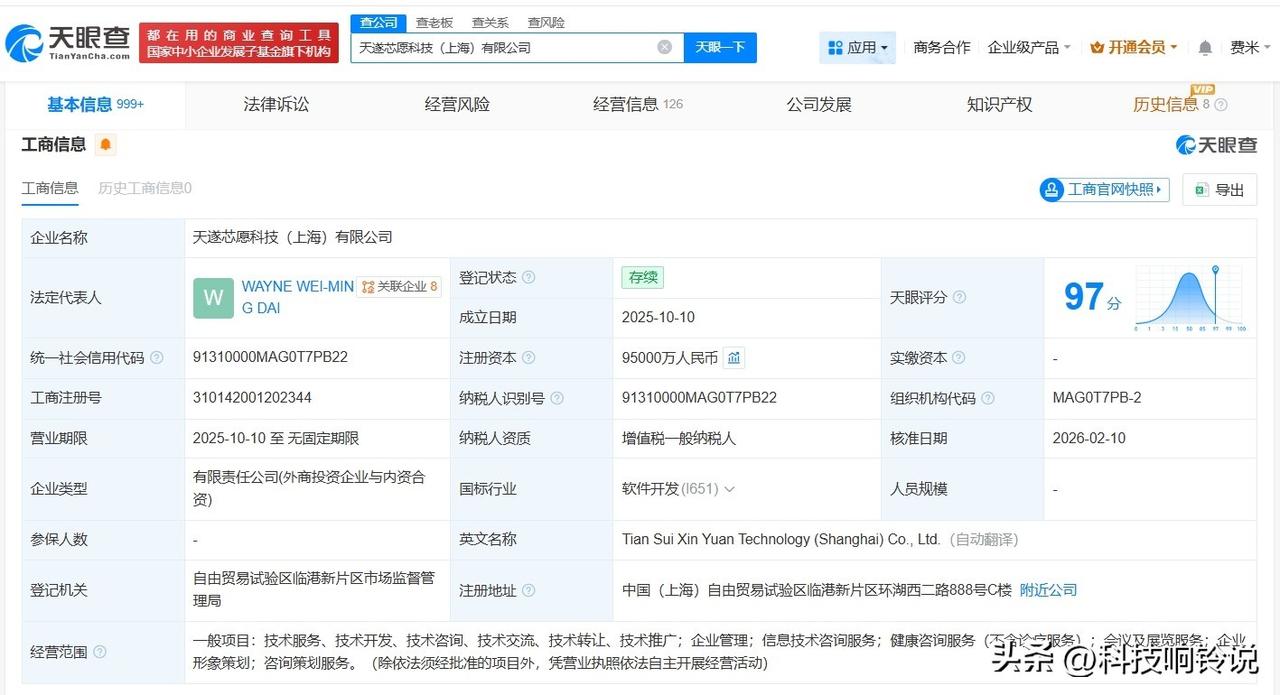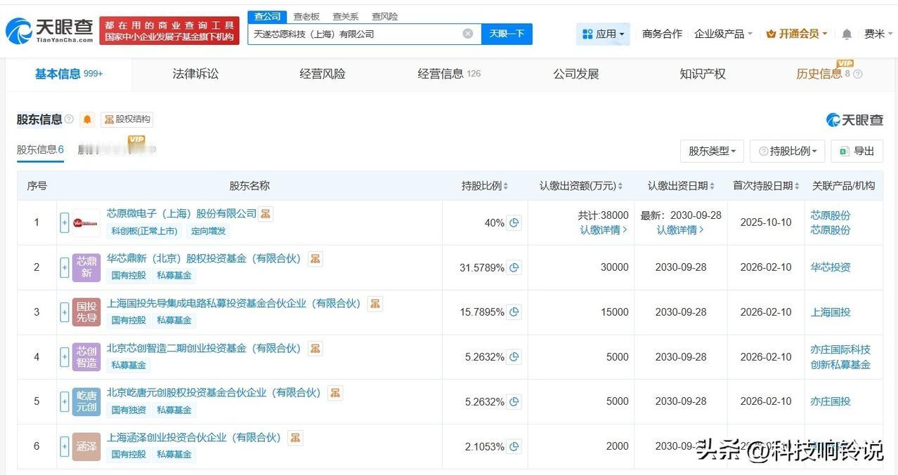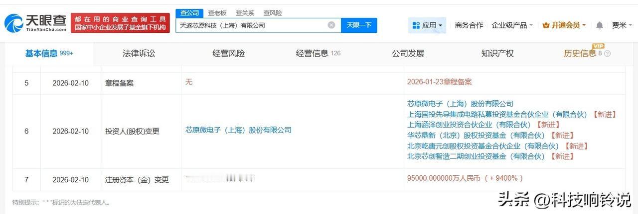 【国家大基金三期旗下基金等入股芯原股份旗下公司】 天眼查App显示,近日,天遂芯愿科技(上海)有限公司发生工商变更,新增国家大基金三期旗下华芯鼎新(北京)股权投资基金(有限合伙)、上海国投先导集成电路私募投资基金合伙企业(有限合伙)等为股东,同时,注册资本由1000万人民币增至9.5亿人民币,增幅9400%。 天遂芯愿科技(上海)有限公司成立于去年10月,法定代表人为WAYNE WEI-MING DAI,经营范围包括企业管理、信息技术咨询服务、健康咨询服务等。股东信息显示,该公司现由芯原股份(688521)及上述新增股东共同持股。 天眼查信息: