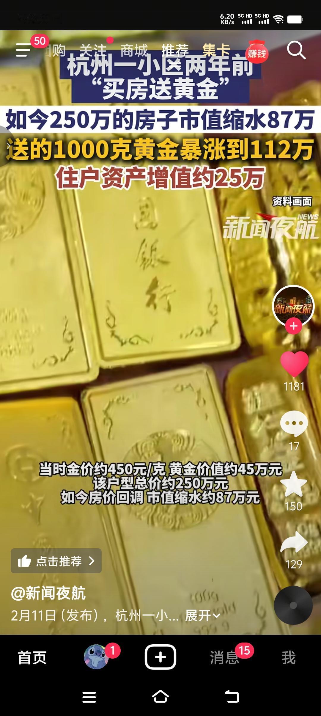 有心栽花花不发,无意插柳柳成荫。杭州一小区两年前推出买房送黄金的促销,买250万的房子送1000克黄金,当时金价450块钱一克,1000克就是45万。如今开发商做梦也不会想到,金价会涨到1120元/克,尽管房子市值缩水87万,但住户的资产依然增值约25万。看来住户还得感谢开发商,如果当年搞促销不是送黄金,而是打折或送全屋定制,那么住户可就赔惨了。