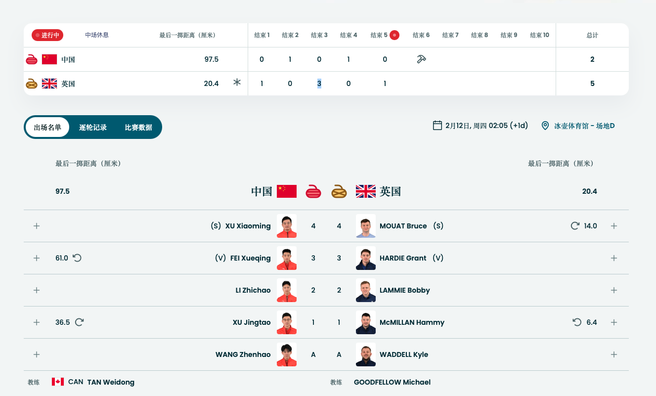 虎扑02月12日讯冰壶男子循环赛:中国队vs英国队进行中。