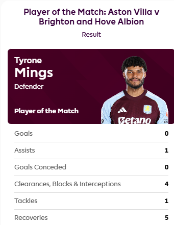虎扑02月12日讯英超第26轮,阿斯顿维拉1-0击败布莱顿,明斯造乌龙制胜。