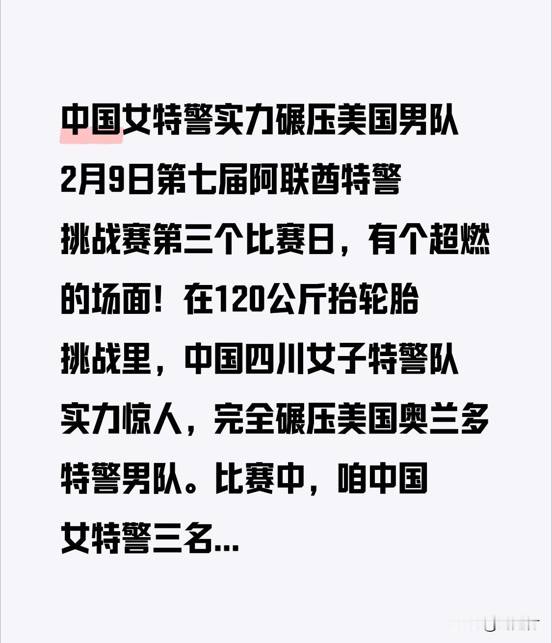 中国女特警实力碾压美国男队 中国女特警实力碾压美国男队 2月9日,第七届阿联酋特警挑战赛第三个比赛日,场面超燃!在120公斤抬轮胎挑战中,中国四川女子特警队实力惊人,完全碾压美国奥兰多特警男队。 比赛里,中国女特警三名队员默契配合,稳稳抬起轮胎,快速向终点行进。反观美国男队,状况不断。三名队员起步就差点抬不起轮胎,一名队员还因发力不稳直接跪倒,最终轮胎在起点附近脱手。 这鲜明对比太振奋人心了!谁说女子不如男,中国女特警用实力证明,巾帼不让须眉!