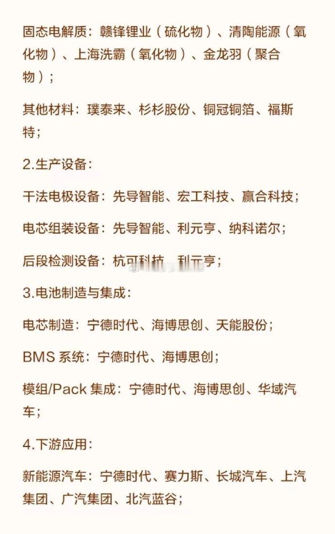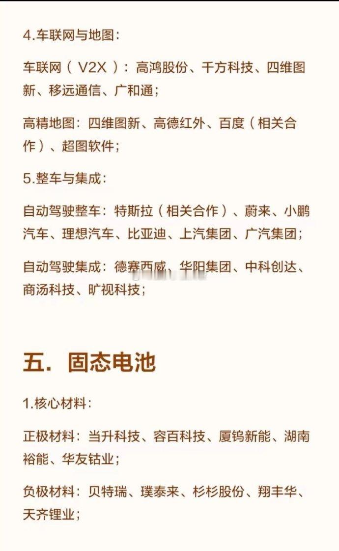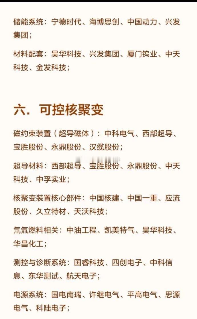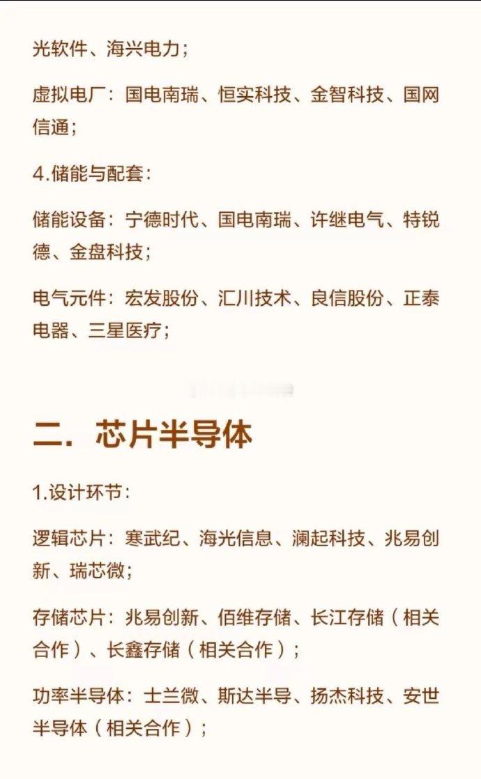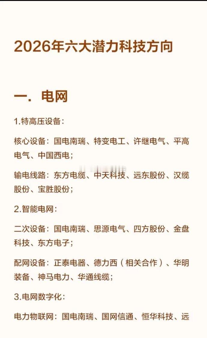 2026年六大潜力科技方向2026年六大潜力科技方向一.电网1.特高压设备:核心设备:国电南瑞、特变电工、许继电气、平高电气、中国西电;输电线路:东方电缆、中天科技、远东股份、汉缆股份、宝胜股份;2.智能电网:二次设备:国电南瑞、思源电气、四方股份、金盘科技、东方电子;配网设备:正泰电器、德力西(相关合作)、华明装备、神马电力、华通线缆;3.电网数字化:电力物联网:国电南瑞、国网信通、恒华科技、远光软件、海兴电力;虚拟电厂:国电南瑞、恒实科技、金智科技、国网信通;4.储能与配套:储能设备:宁德时代、国电南瑞、许继电气、特锐德、金盘科技;电气元件:宏发股份、汇川技术、良信股份、正泰电器、三星医疗;二.芯片半导体1.设计环节:逻辑芯片:寒武纪、海光信息、澜起科技、兆易创新、瑞芯微;存储芯片:兆易创新、佰维存储、长江存储(相关合作)、长鑫存储(相关合作);功率半导体:士兰微、斯达半导、扬杰科技、安世半导体(相关合作);图像传感器:豪威集团、韦尔股份、格科微;2.制造环节:晶圆制造:中芯国际、华虹公司、华润微、士兰微;外延片:三安光电、天岳先进、沪硅产业、立昂微;3.封装测试环节:封装测试:长电科技、通富微电、华天科技、晶方科技、深科技;4.设备与材料:核心设备:北方华创、中微公司、拓荆科技、盛美上海、屹唐股份;关键材料:安集科技、江丰电子、沪硅产业、彤程新材、雅克科技;