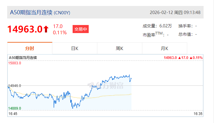 上证报中国证券网讯2月12日,富时中国A50指数期货在上一个交易日夜盘收涨0.15%的基础上高开,截至9时13分,主力合约涨0.11%。