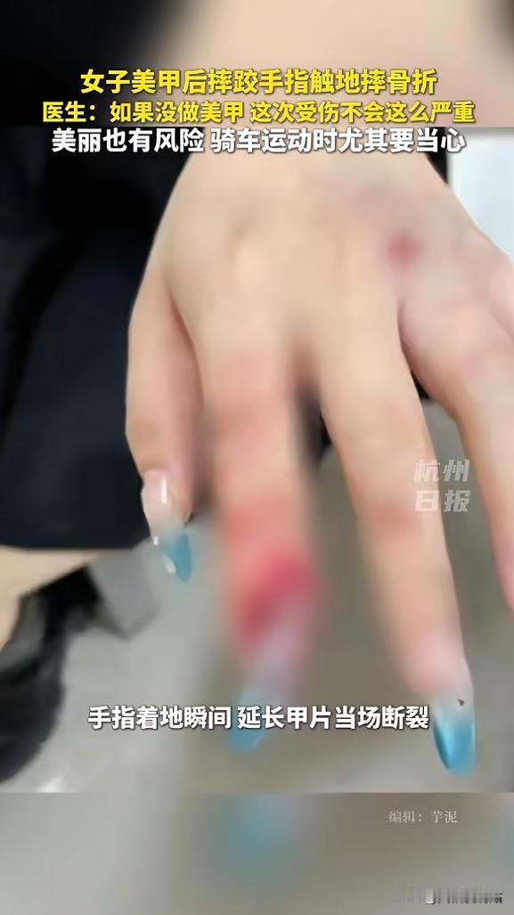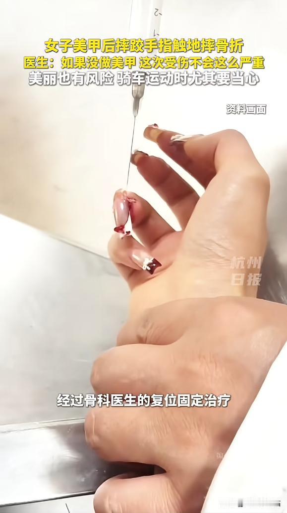 “悲剧还是发生了!”近日,浙江杭州,一女子为了让手指显得更修长,在做美甲时特意延长指甲,不料骑电动车不小心摔了一跤,因为美甲太长,导致指甲掀翻,手指直接骨折,疼得她哇哇直叫!医生:如果不做美甲,伤害根本不会这么严重! 急诊拍片室里,灯光很白,机器刚吐出影像,医生和家属一起凑过去看。 片子上,左手食指的骨头,已经明显不在原来的位置,像被硬生生掰歪了一样,对医生来说,这是需要处理的骨折;对当事人来说,是钻心的疼。 受伤的是杭州的王女士,2月4日,她刚做了延长甲,指甲被接长、加固、打磨完之后,手指显得又细又直,她很满意,那天出门时,她大概不会想到,这份漂亮在几个小时后,会变成麻烦。 意外发生在骑电动车的时候,路面有点不平,车身晃了一下,她条件反射地用手去撑,这个动作再常见不过,很多人摔倒时都会这样做。 如果没有那层加长的甲片,先着地的通常是手掌,力量被分散,最多擦破皮,但这一次,最先碰到地面的,是比指尖更往前探出的硬甲。 冲击力顺着那块延长的部分往回传,等于把力量集中在指头上,甲片被掀起,连带着甲床受伤,骨头也没能扛住,直接错位。 被推进急诊时,她疼得脸色发白,医生的判断很直接:这类情况不是稀奇事。 延长甲让受力方式改变,出问题的概率自然会增加,如果没有做这么长,很多时候就是简单的挫伤,不至于发展到骨折。 类似的情况,急诊并不少见,2025年7月,江苏常州的高女士,在骑车途中低头接电话,慌乱中,长甲片猛地撞在大腿上,没有摔倒,但冲击已经足够,小指的指甲当场掀开,血很快流出来。 隔了没多久,同一家医院又来了一个二十岁的女孩,她的甲片价格不低,做得很夸张,和朋友打闹时被碰到,指甲翘起、撕裂,疼得直掉眼泪。 这些情境听起来都很普通:骑车、接电话、玩笑推搡,但当指甲被延长、变硬之后,原本安全的动作就多了风险。 有医生给过一个相对保守的建议:延长的部分最好别太夸张,控制在本甲长度的一小段范围内。 再往外多一点,受力就会变得很不一样,手指本来是灵活、柔软的,一旦变成“硬杠杆”,出事时首先受伤的就是自己。 除了这种突然发生的损伤,时间久了,还会出现别的问题,人工甲片再贴合,也难免有缝隙。 洗手、洗澡之后,水分可能残留在里面,不容易干,闷在下面的环境,对细菌来说很合适,再加上为了让甲片更牢,有时会把本来的指甲磨薄,等于削弱了原本的保护。 一开始也许只是颜色变化、发炎,但拖得久了,处理起来就更麻烦,喜欢做美甲本身没有问题,让人开心、提升自信,这些都很实际。 只是当它影响到日常活动,尤其是在运动、骑行、需要手部支撑的情况下,风险就需要被认真考虑。 如果已经做了很长的甲,参与这些活动时最好多留意,能摘就摘,或者想办法给手指一些额外保护,很多事故,往往就发生在一瞬间,人还没反应过来,伤已经造成了。 王女士后来要面对的,是复位、固定,以及一段时间的不方便,和当初坐在美甲店里的期待相比,这个结果显然不是她想要的。 漂亮和安全之间,有时需要自己做取舍,毕竟,手指原本的功能,是用来抓握和保护自己的。 信源:《女子美甲后摔跤手指触地摔骨折 医生:如果没做美甲,这次受伤不会这么严重。》杭州日报