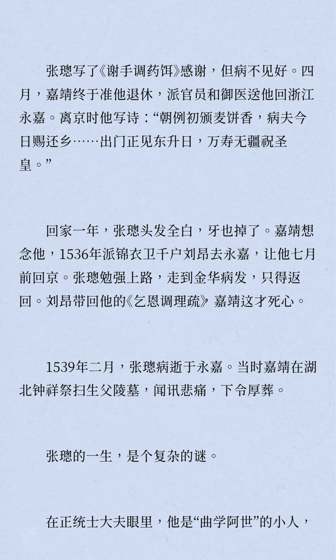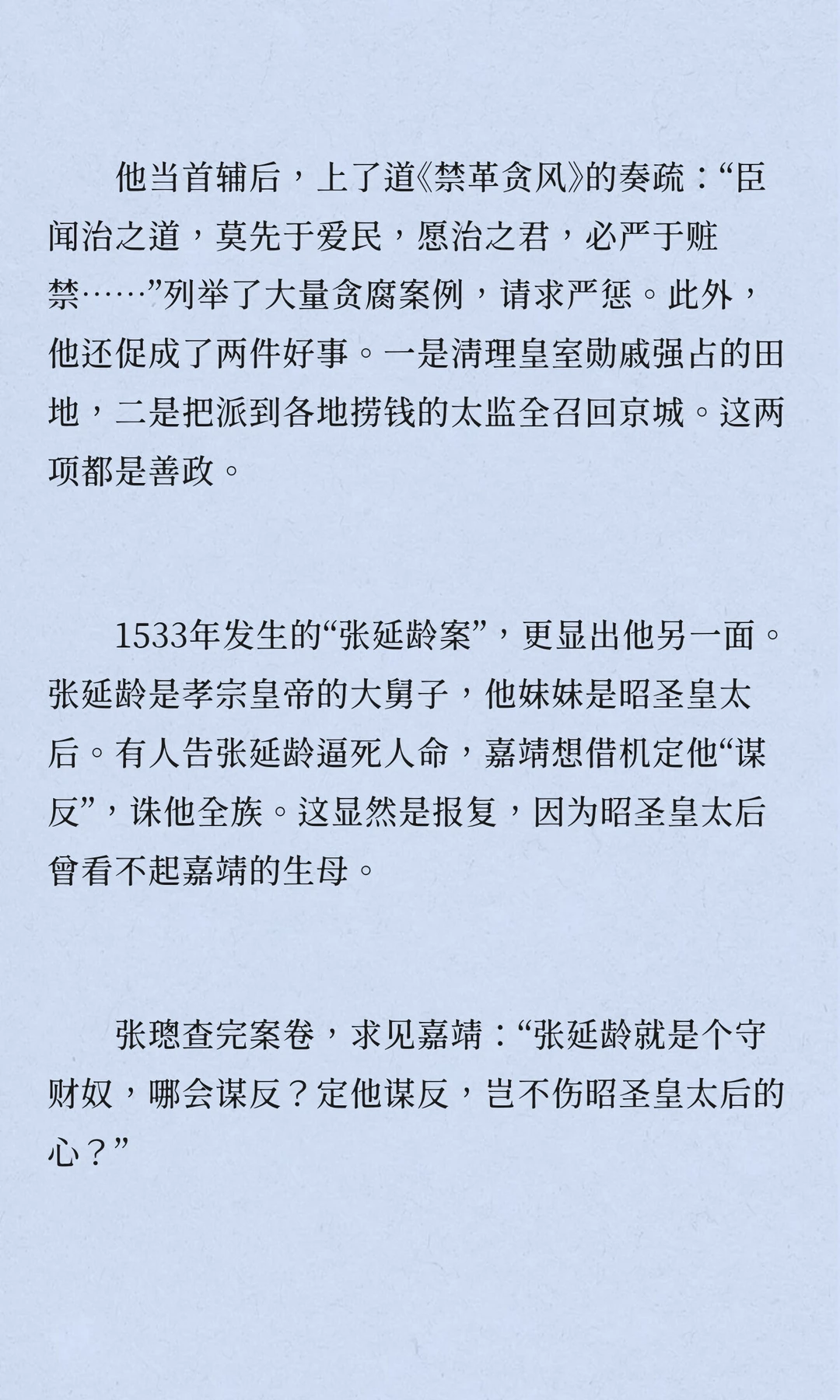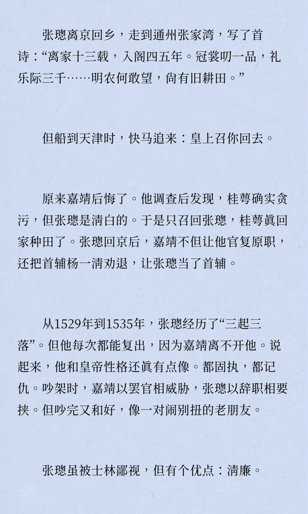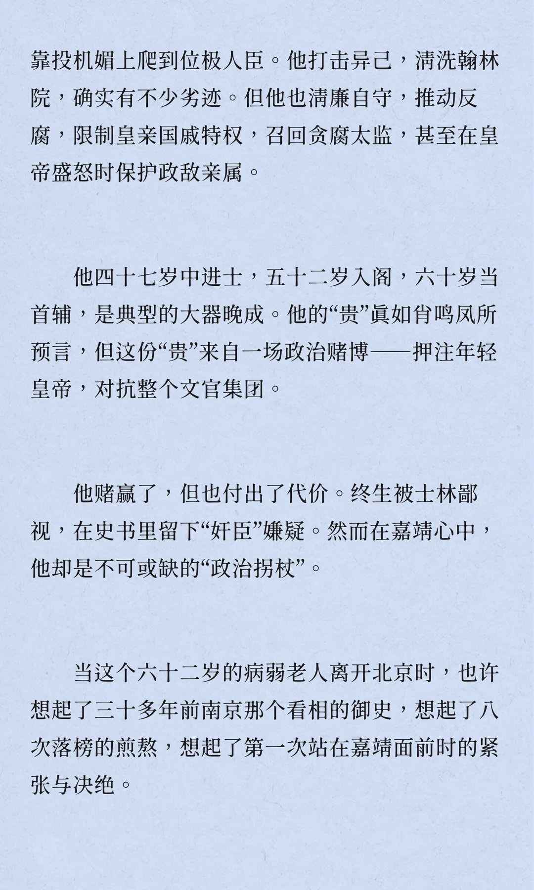 张璁,明朝,浙江永嘉人,四十七岁中进士,五十二岁入阁,六十岁当首辅,六十二岁病逝。他推动反腐,限制皇亲国戚特权,召回贪腐太监,但被士林鄙视,留下“奸臣”嫌疑。