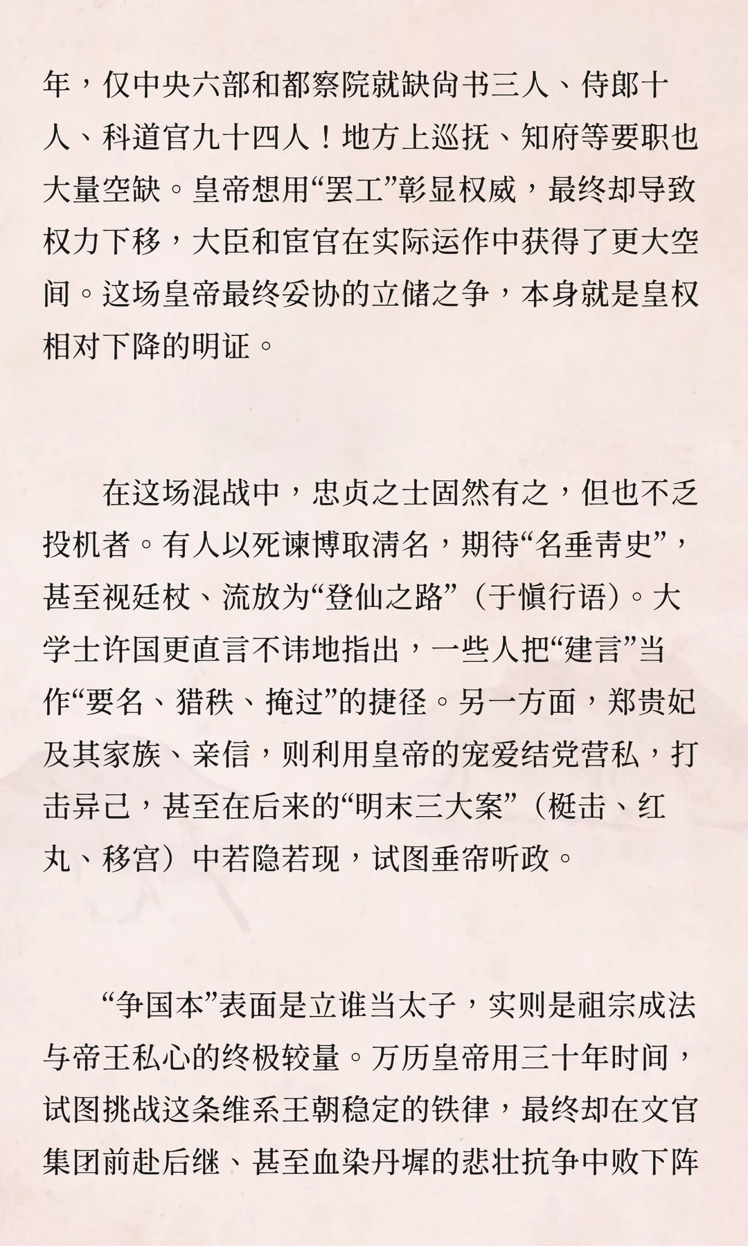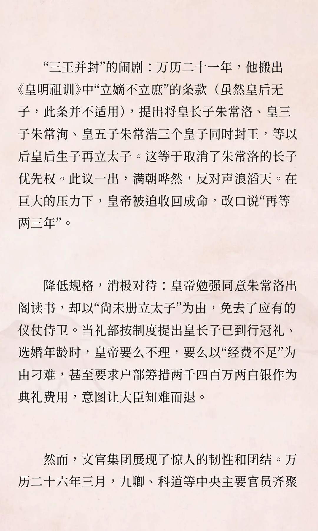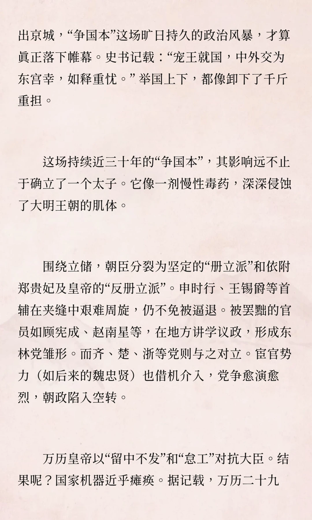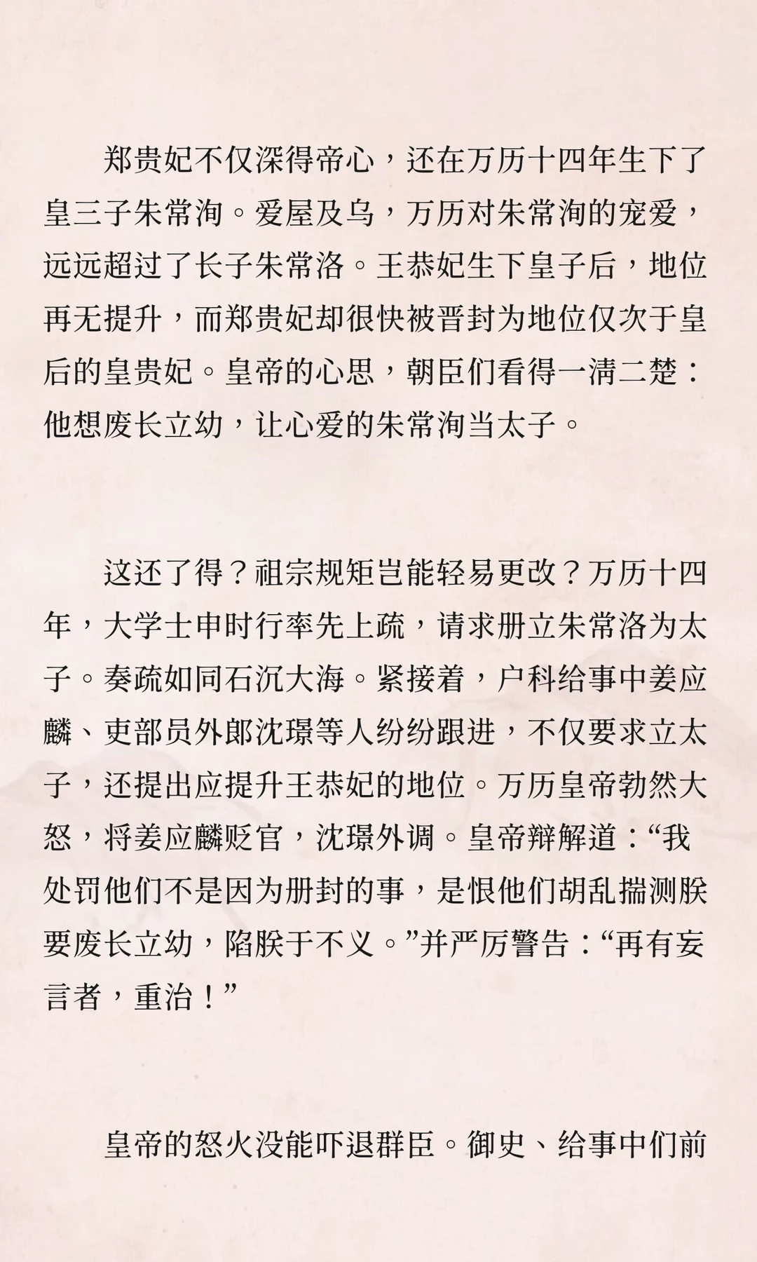 万历皇帝朱翊钧偏爱郑贵妃之子朱常洵,欲废长立幼,引发“争国本”之争。群臣抗争,皇帝最终册立朱常洛为太子,但党争加剧,朝政瘫痪……