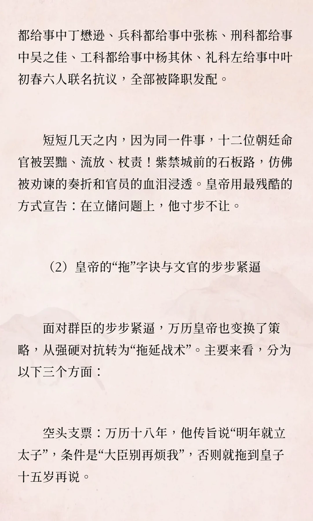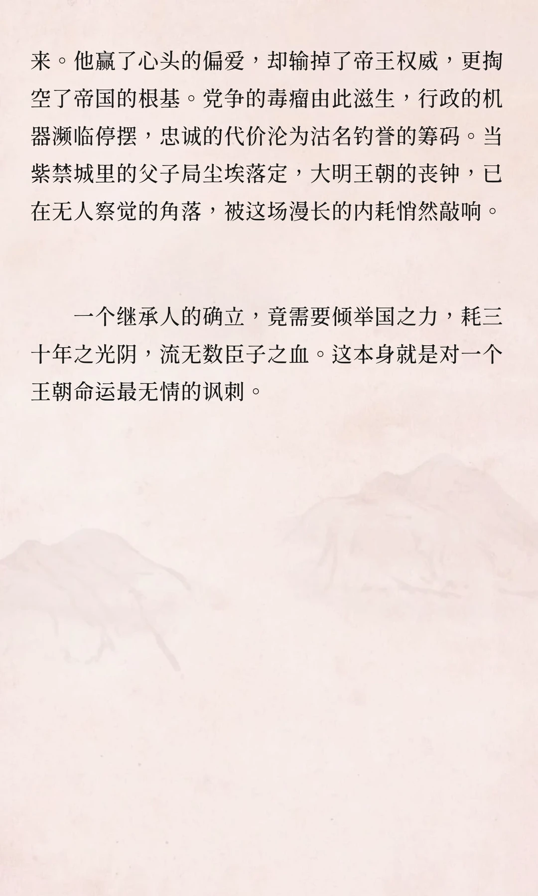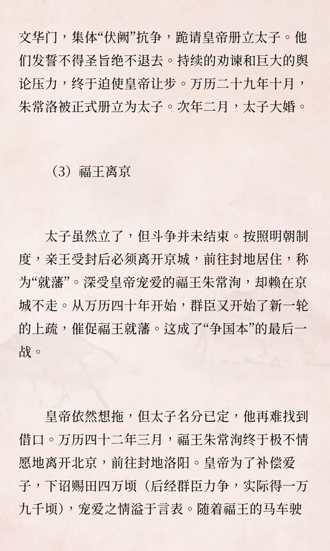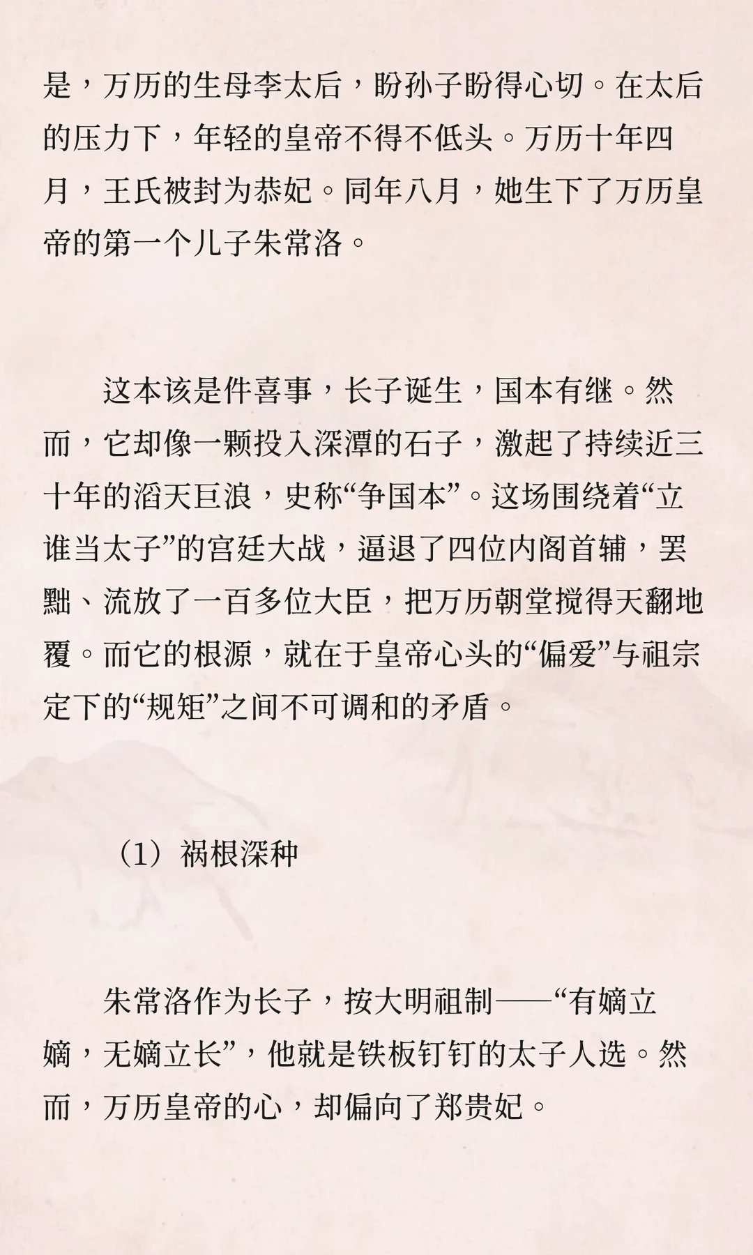 万历皇帝朱翊钧偏爱郑贵妃之子朱常洵,欲废长立幼,引发“争国本”之争。群臣抗争,皇帝最终册立朱常洛为太子,但党争加剧,朝政瘫痪……