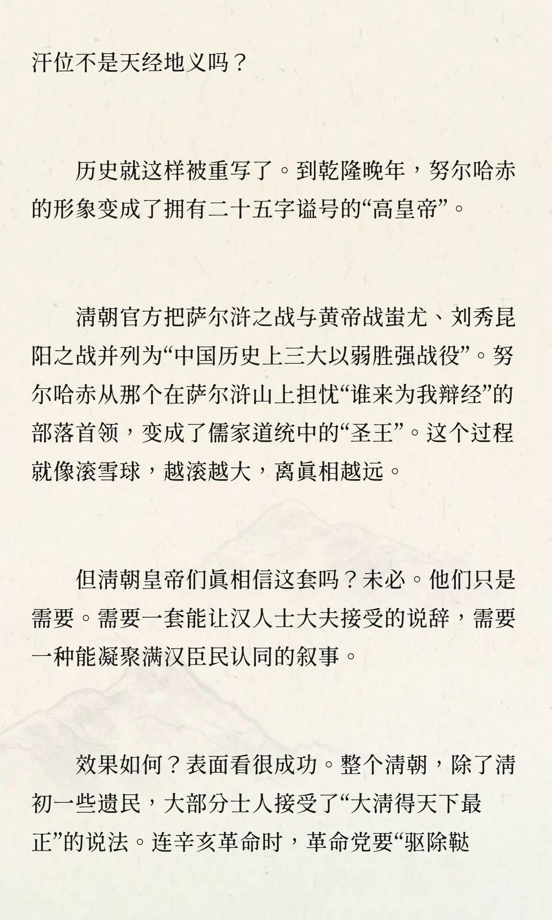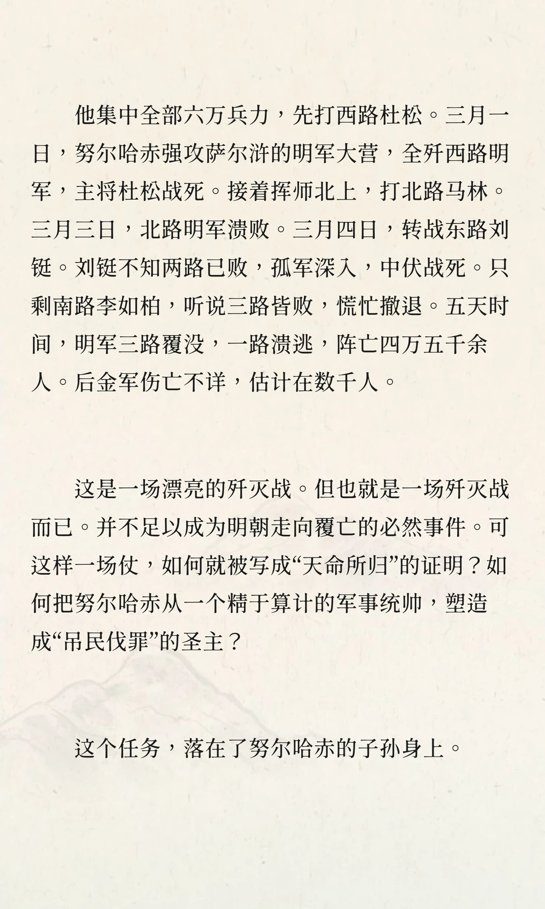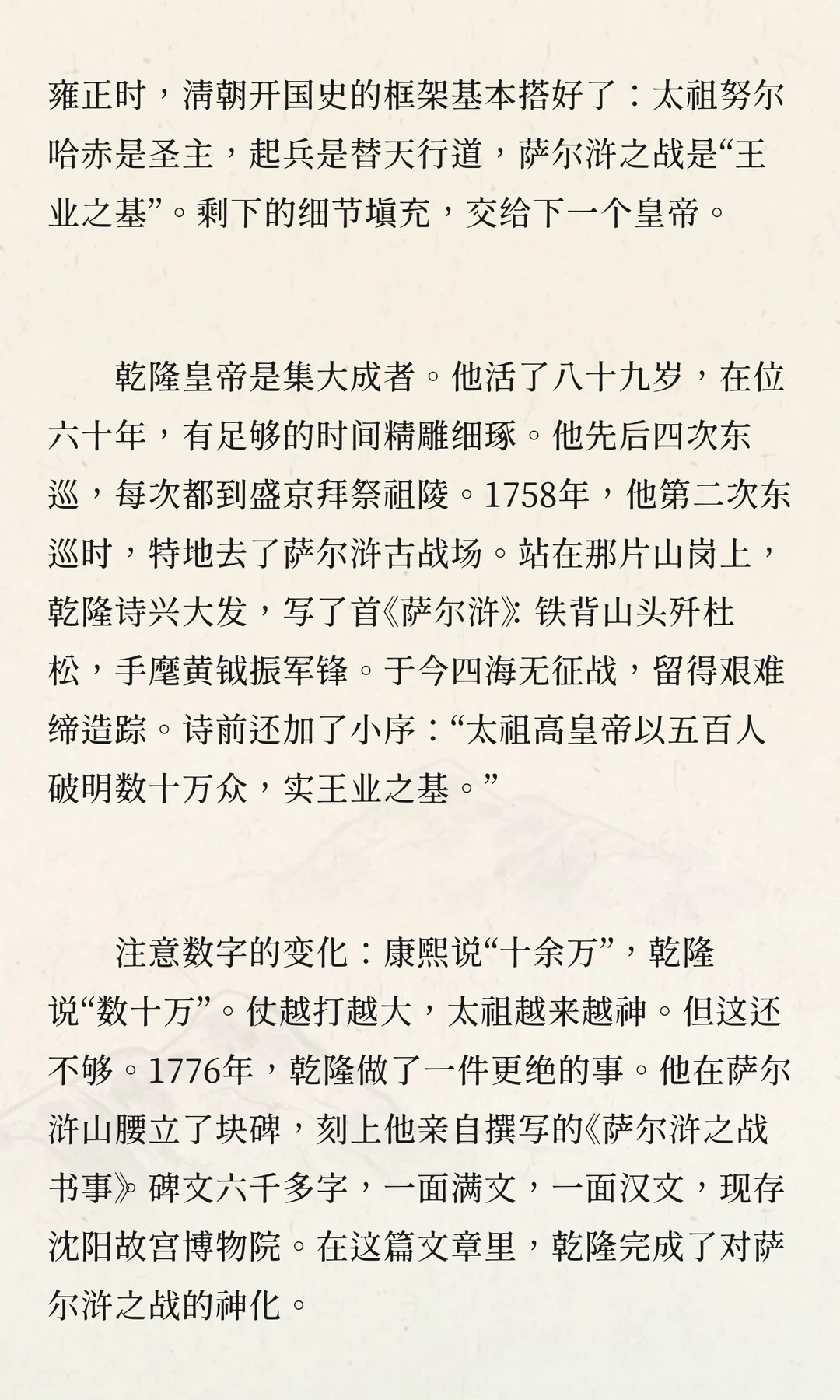 努尔哈赤通过萨尔浒之战统一女真,后被康熙塑造成“天命所归”的圣主。清朝通过编修《太祖高皇帝圣训》和《萨尔浒之战书事》等,将努尔哈赤神化,构建了“大清得天下最正”的合法性叙事。