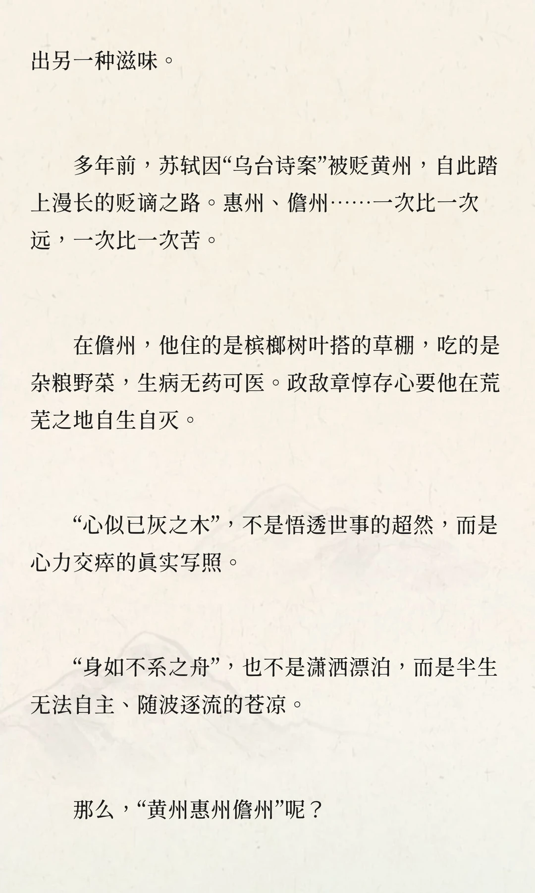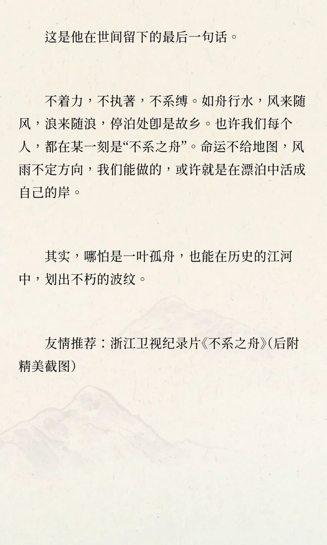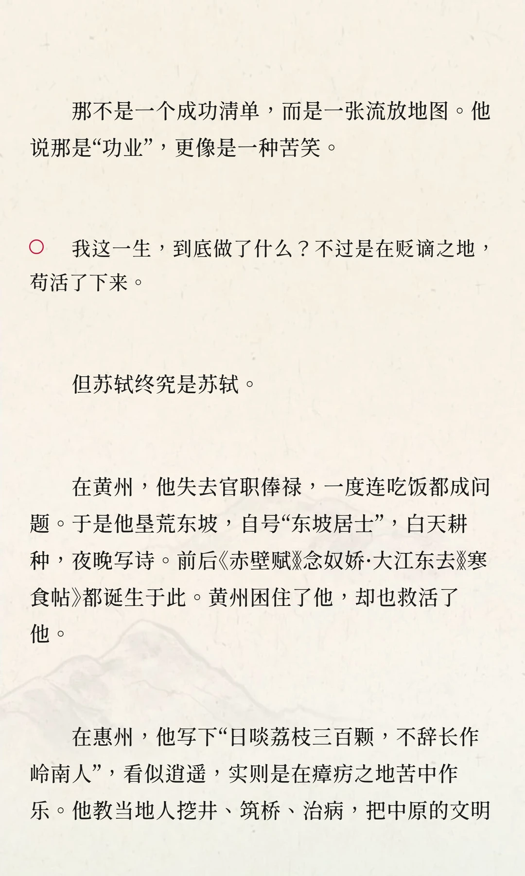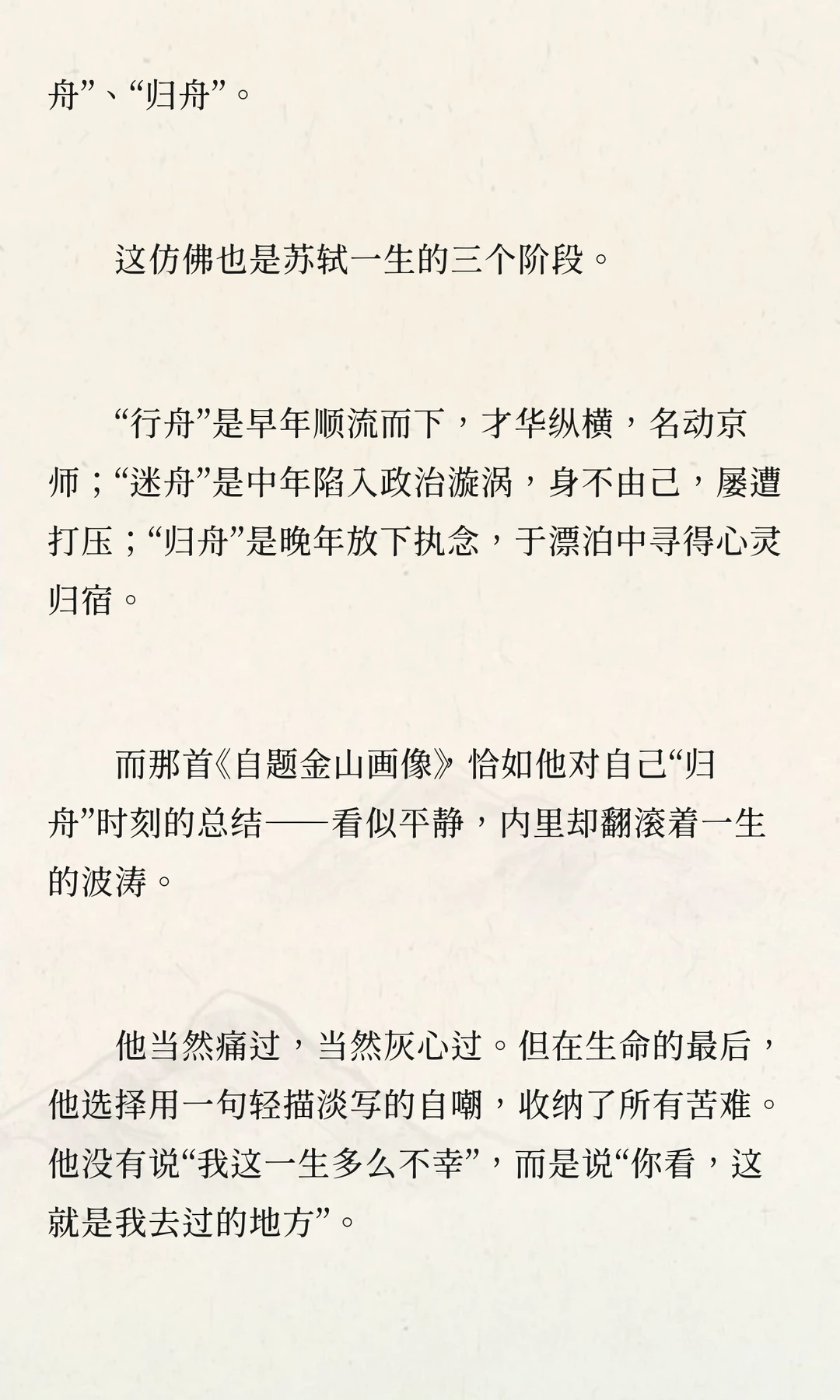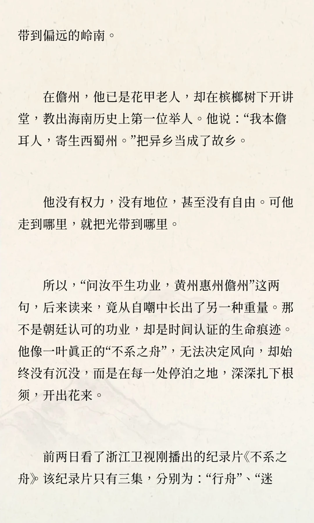 昨日,看了浙江卫视出品的一部有关苏轼的纪录片《不系之舟》,有感而发,遂作此文。 纪录片不长,一共三集。分别以“行舟、迷舟、归舟”为线索。《行舟》讲成长与告别,《迷舟》讲失意与自救,《归舟》讲晚年与通达。三集层层递进,串联起苏轼从眉山出发、辗转一生,最终终老常州的人生旅程。 让我们跟随文化学者大山的足迹,穿越千年山水与人生困境,通过苏轼,学会如何在风浪中与自己和解,依然选择温柔对待世界。 喜欢历史人文的小伙伴不要错过。(文末附纪录片精美截图)
