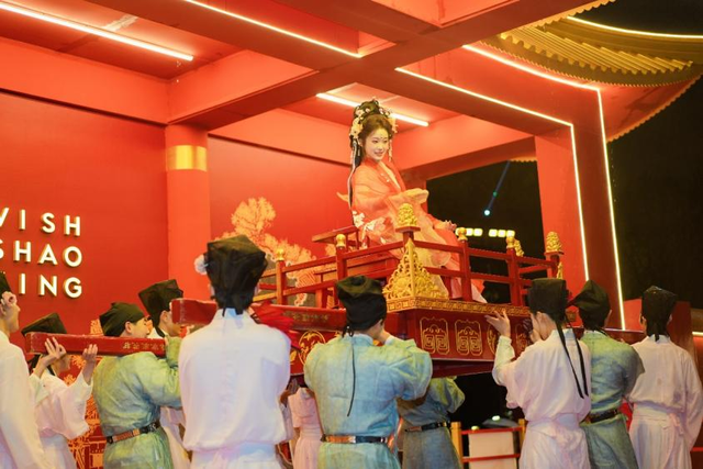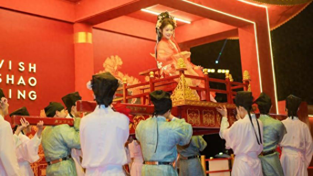 在城市广场,游客可以漫步于“宋韵瓦市”,与身着宋制华服的NPC互动对诗,或驻足欣赏“鱼龙百戏”舞台上的《绍兴有戏》等主题演艺,或跟随“花魁”队伍穿行于街巷,感受流动的风景。