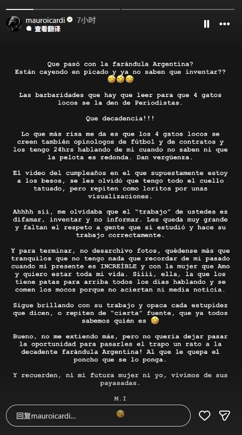近日,一段视频在网络上流传,声称伊卡尔迪在托雷拉的生日会上亲吻其他女子。伊卡尔迪今日在社媒发布长文回击谣言,措辞严厉地抨击媒体和捏造他私生活故事的人。