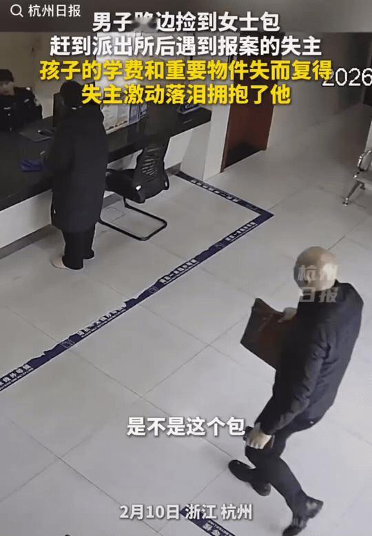 浙江萧山,女子哭着在派出所报案,装着女儿学费的包丢了。女子十分焦急的时候,回头一看,一个光头大哥拿着包进来了。她激动地给了大哥一个拥抱。 女子不小心把包丢了,包里装着自己刚发的2000元年终奖,她准备用这个钱给女儿交学费。包里还有课本、手机和钥匙等重要物品。 女子把包丢到了路上,正好光头大哥开车经过,他看到地上有个包,就停车捡起来了。大哥赶紧就送去派出所,大哥进门时,女子正在跟民警介绍情况。一位民警看到大哥提着包进来,就问女子:“是不是这个包?”女子回头一看,正是自己的包。 女子接过包激动地给了大哥一个拥抱。这发自内心的感动,让我们看出女子内心有多着急。毕竟包里装着女儿的学费。 网友说,这一抱,是发自内心对好心人真诚感动的流露。两千块钱对有钱人真的不算什么,但对于底层百姓家庭却是生活的唯一。感恩世间还有好心人,愿善爱传递。 还有一位网友说,不是钱多少的问题,要是真的丢了这一年过的都憋屈。这下好了,做好事的开心一年,失主失而复得高高兴兴地过新年。 也有一位网友说,要是他也会这么做,虽然他身无分文,身负外债,被网贷催收,独自一人过年,但他依然会选择还给她,不想有人比自己还痛苦,何况还是个母亲! 正值新年之际,如果丢了重要的东西,肯定影响过年的心情,大家辛苦一年了都希望过一个开心的新年。为这位光头大哥点赞!感谢他及时把包送去派出所,让万分着急的女子,悬着的心瞬间踏实了,也让这位母亲能够开心过新年。