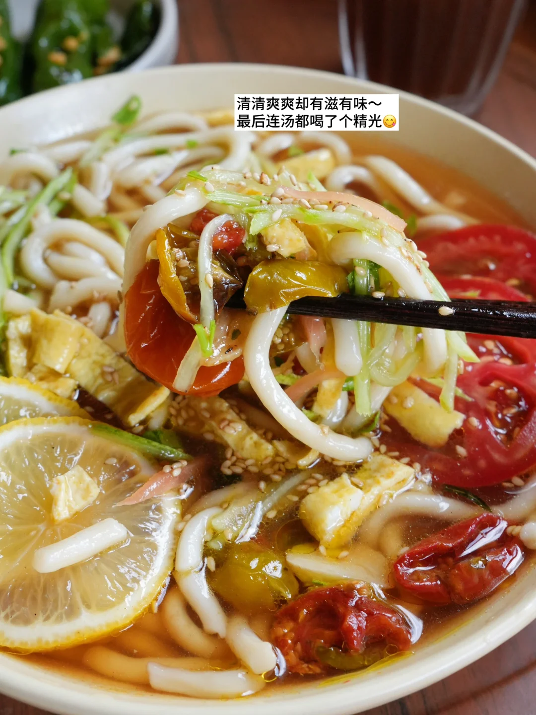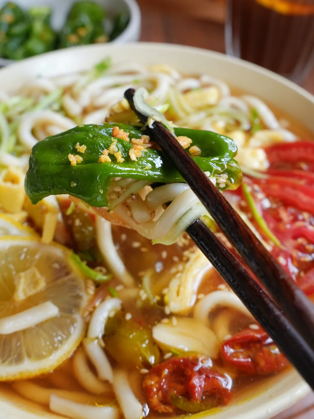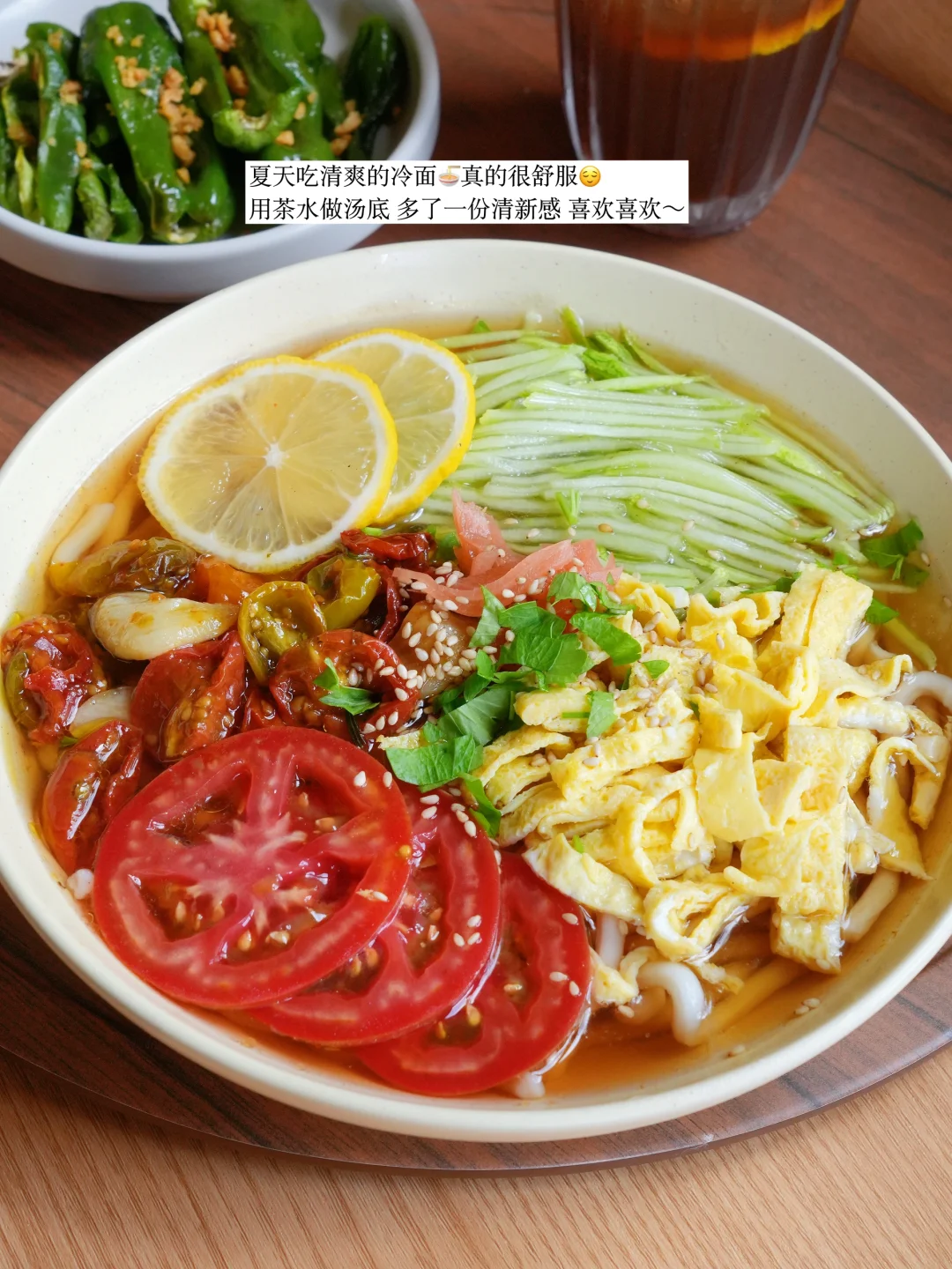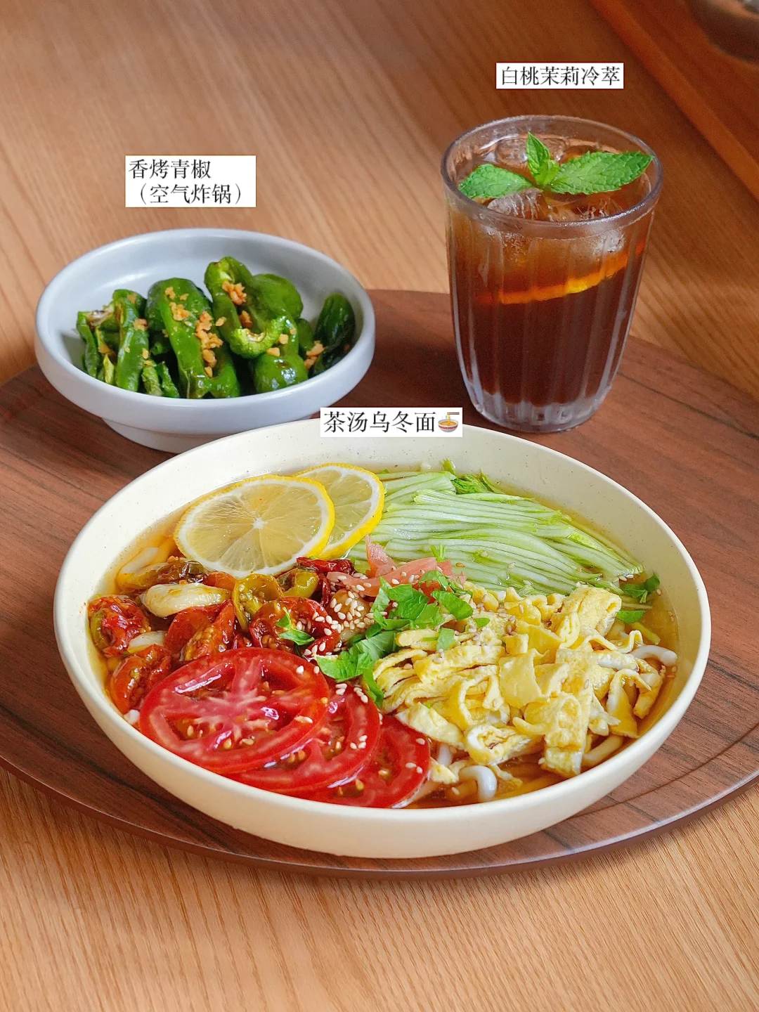 今日份健康一人食分享: ▪️茶汤乌冬面🍜(微波炉) ▪️香烤青椒🫑(空气炸锅) ▪️白桃茉莉冷萃🥤 👩🍳茶汤乌冬面🍜 茶作为汤底,口味更清爽,味道层次更丰富,搭配夏日时令蔬菜番茄和黄瓜(我还加了自制的油浸小番茄)清淡却不寡淡,有滋有味有颜值~ 空气炸锅8分钟做烤青椒,同时微波炉烹饪乌冬面和准备配菜,不开火无油烟10分钟内搞定健康漂亮的一餐~