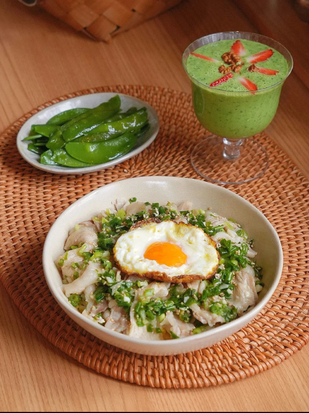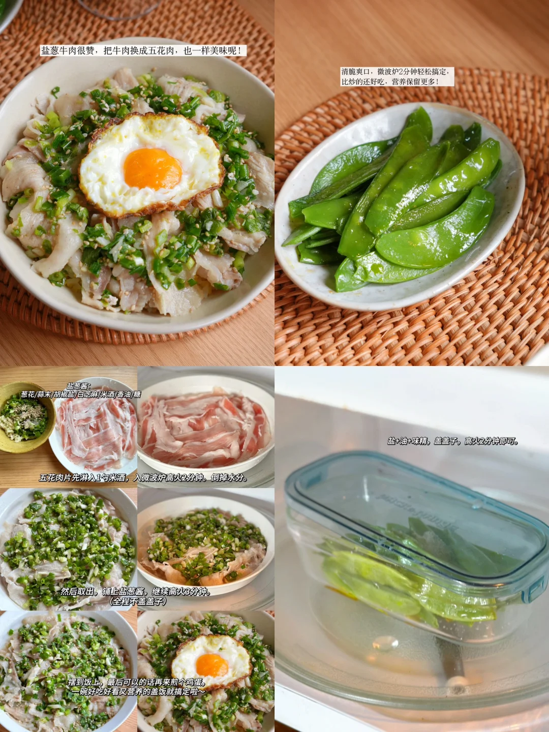 微波炉盐葱牛肉盖饭+微波炉清炒荷兰豆+香蕉羽衣甘蓝酸奶
