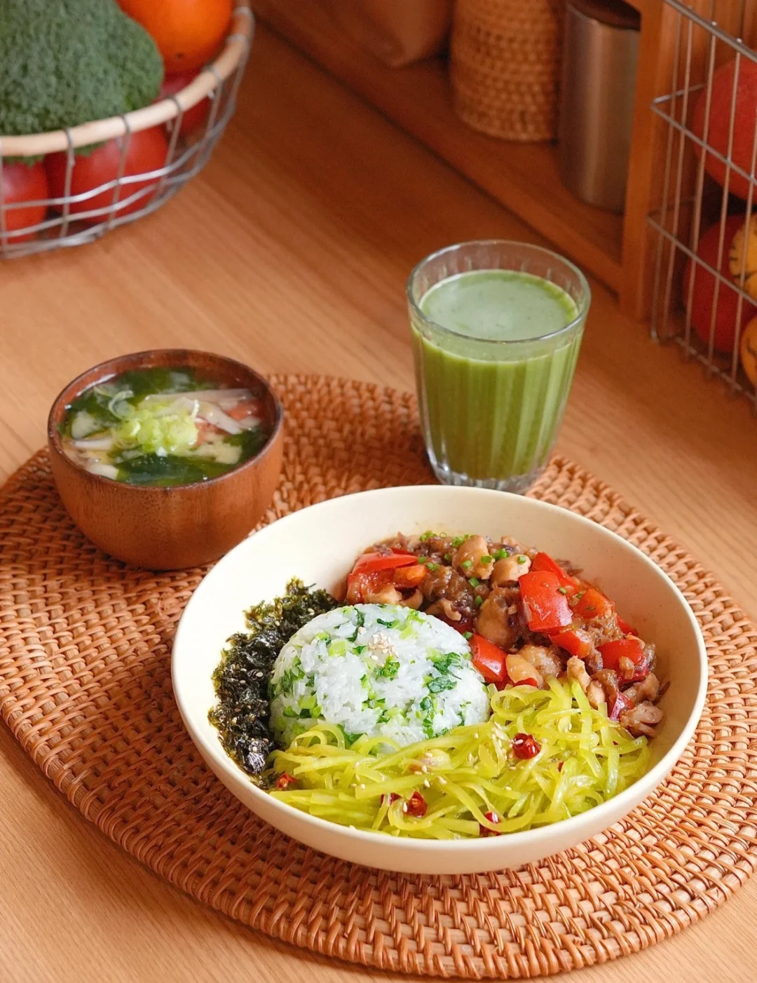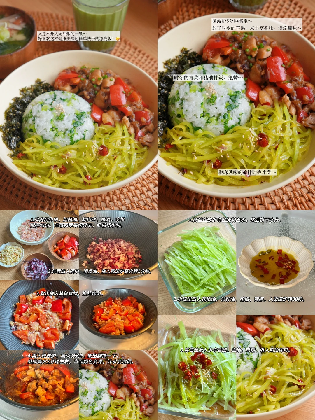 微波炉苹果烧鸡肉+凉拌椒麻莴苣丝+菌菇味噌汤+猪油菜饭
