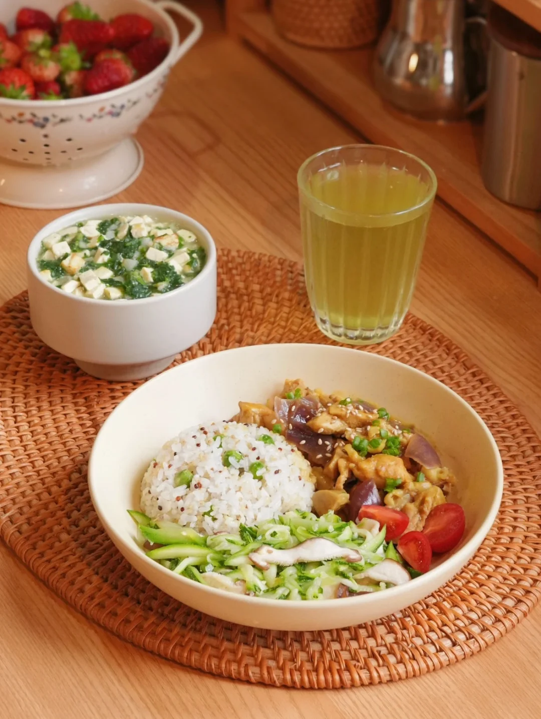 微波炉咖喱鸡肉+微波炉香菇南瓜丝+豌豆藜麦饭+荠菜马蹄豆腐羹