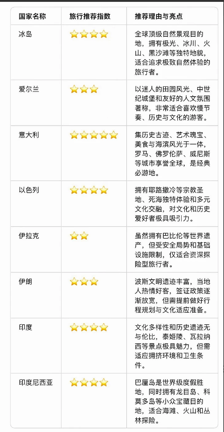 ✈️ 以“I”开头国家的旅行推荐指数(满分5星)