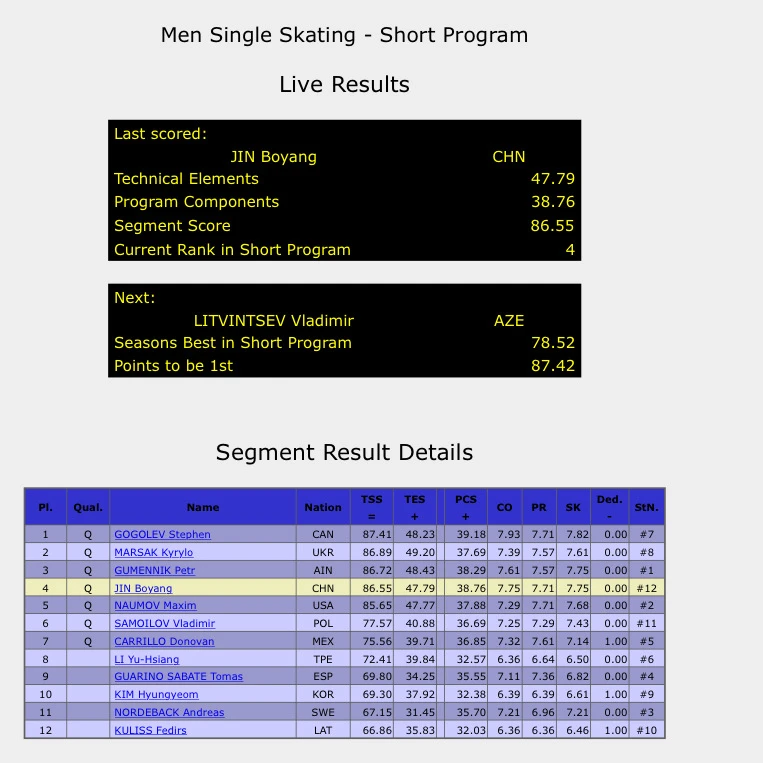 86.55分 无悬念晋级第二阶段自由滑。 后外点冰四周,3A和3周连跳, 都无可挑剔,P分也还行。 平昌冬奥会第四, 北京冬奥会第九, 一转眼金博洋已经快30岁了, 坚持到现在不容易, 期待天天的自由滑!